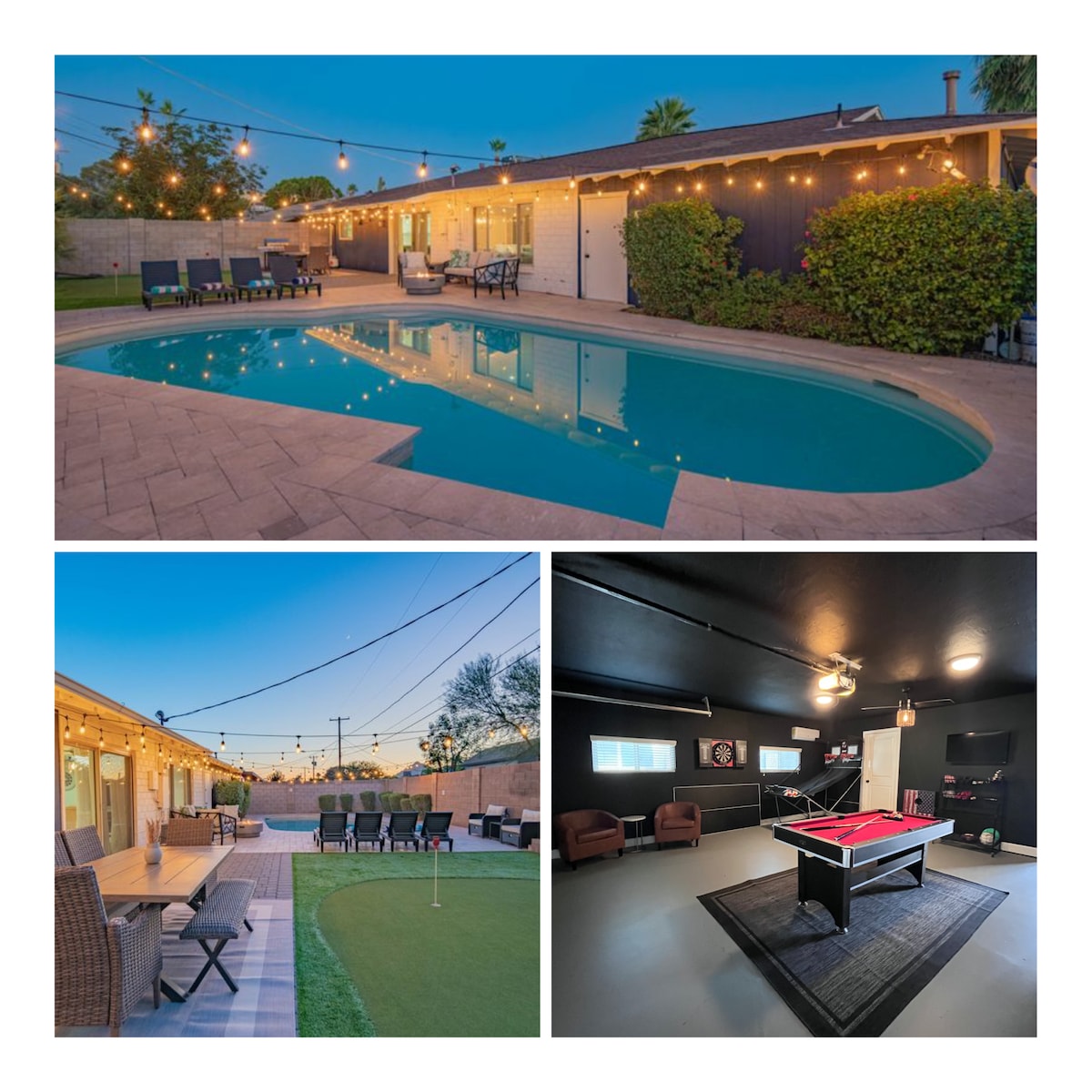Welcome to The Hidden Hacienda Scottsdale! A fun, whimsical retreat with cowboy-chic decor, pool, spa, karaoke, and games—perfect for bachelorettes, families, or golf getaways. Sleeps 10 with comfy beds, smart TVs, a pool table and a fully stocked kitchen. Lounge beneath swaying palm trees, practice your swing on the mini putting green, or unwind in your private backyard oasis with cozy seating fire-pit and outdoor tv. Minutes to Kierland Commons, top golf courses, Spring Training and more!