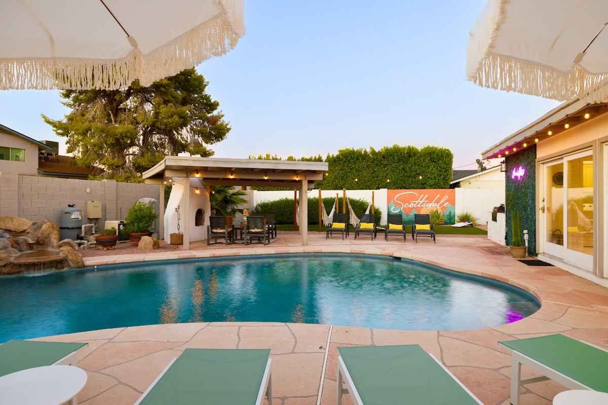 "Vacation Mode" Activated! Relax in style at this Mojave inspired poolside retreat! Remodeled w/ open concept and a dreamy desert aesthetic, this 3 bedroom, 2 bath home will keep you and your guests endlessly entertained. Enjoy outdoor Arizona living at it's best, lounge poolside with your own private cabana, catch up with your friends, BBQ w/ the fam, take a selfie with our scottsdale mural or hang in the hammock! PRIME location- only 2 miles away from all the Old Town hot spots!