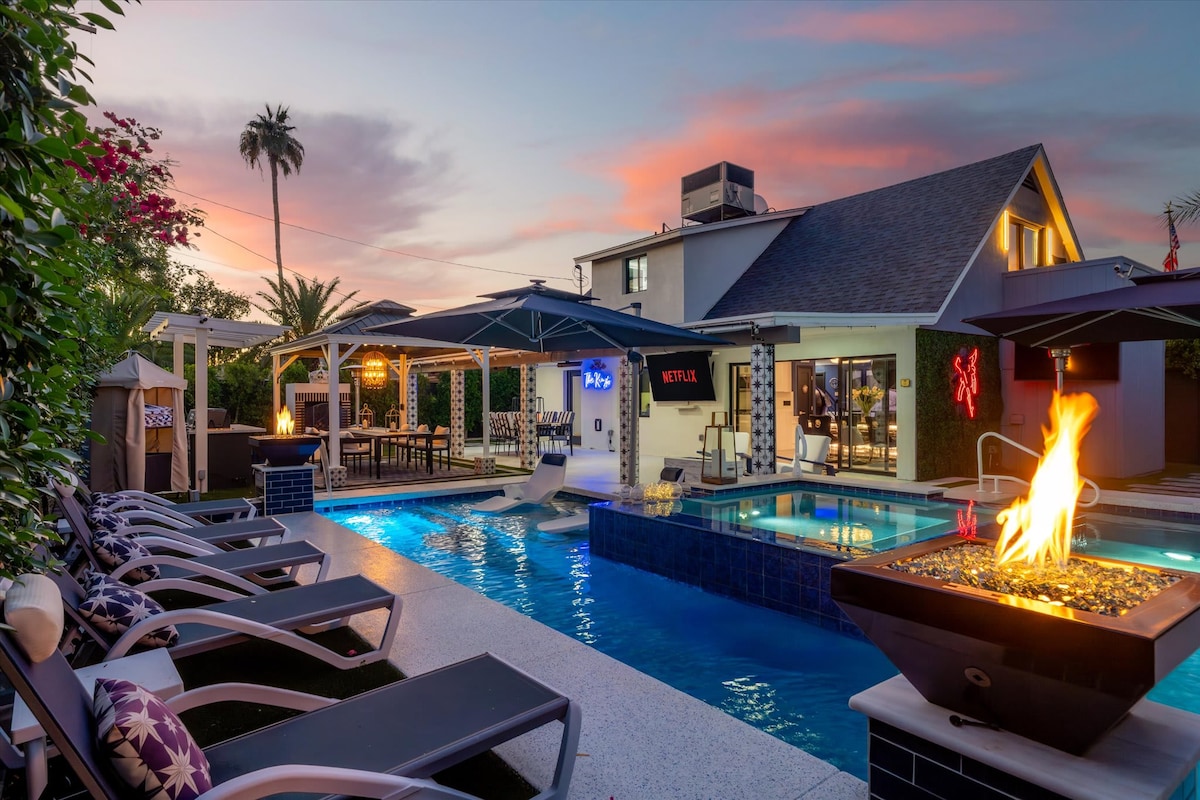 This cozy getaway is located minutes away from Old Town's famous restaurants, shopping, and nightlife. The backyard is an entertainers dream featuring a heated pool, fire pit, outdoor living area, grill, and outdoor dining. The home is tastefully designed for the cultured traveler seeking quality, comfort and an unrivaled experience in the valley of the sun. ➳ Outdoor living w/ firepit and TV ➳ Heated pool with no additional fees ➳ Poolside hammocks ➳ Outdoor fire pit ➳ Outdoor poolside dining