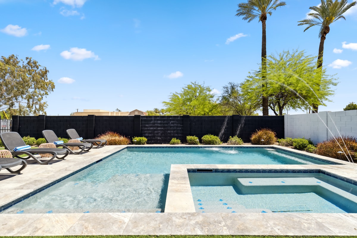 Relax by the pool, soak in the spa, and enjoy the huge, shaded patio with plenty of seating - perfect for enjoying the AZ sun! The spacious backyard is ideal for relaxing pool days or soaking under the stars. Play yard games or have a go at the golf net. Walk to groceries - quick ride to dining, nightlife, golf, and attractions. Fast Wi-Fi and 75" smart TVs. Optional: heated spa ($50/day) or pool + spa ($100/day). TPT license #21511410 Scottsdale License #2028375. Valid ID required at booking.