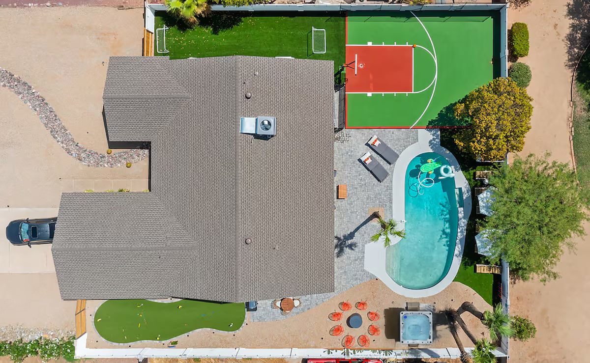 Remodeled 3700 sq.ft. modern Southwest home close to Old Town. Enjoy a free heated pool & hot tub, a large sports backyard, and outdoor kitchen. Perfect for a family vacation, golf trip, and group gatherings. Sleeps 12 people w/ 5 bedrooms, 4 bathrooms, 3 living spaces, 2 dining areas, and 2 fireplaces. The backyard is an outdoor entertainers dream with a built-in gas BBQ and side burner, dining area, fireplace, basketball court, putting green, cornhole, disk golf, large turf lawn, and 70" tv
