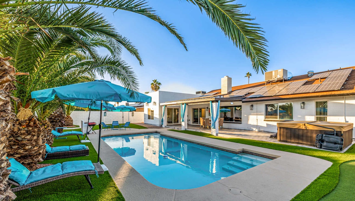 The perfect VACATION home for groups & families! This 2,600 sqft PARADISE has 4 bedrooms, 5 Smart TVs, fast internet, pool table & RESORT-style backyard with heated pool, dining/lounge area, putting green, BBQ. Central location close to all the best Scottsdale has to offer! ★★★★★ "We were impressed the second we walked through the door." ☞ Heated pool ☞ Blazing-fast WIFI ☞ Gorgeous view ☞ Fully stocked kitchen & coffee ☞ Pool table ☞ Games & putting green ☞ Private & quiet