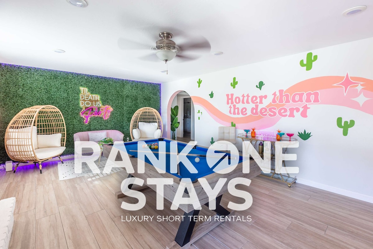 ✓ King Bed w/ Private Bath, 3 Queen, 2 Twin ✓ Pool / Mini Golf / Arcade / Pool table / Fire Pit / Grill / Bar ✓ TV's in all bedrooms ✓ Family friendly yard ✓ RV Parking ✓ Basketball ✓ Reverse Osmosis Filtered Water Rank One Stays presents Great Scott-sdale! - this 4-bed, 2.5-bath haven is more than just a place to stay; it's your ticket to unforgettable memories with family and friends.