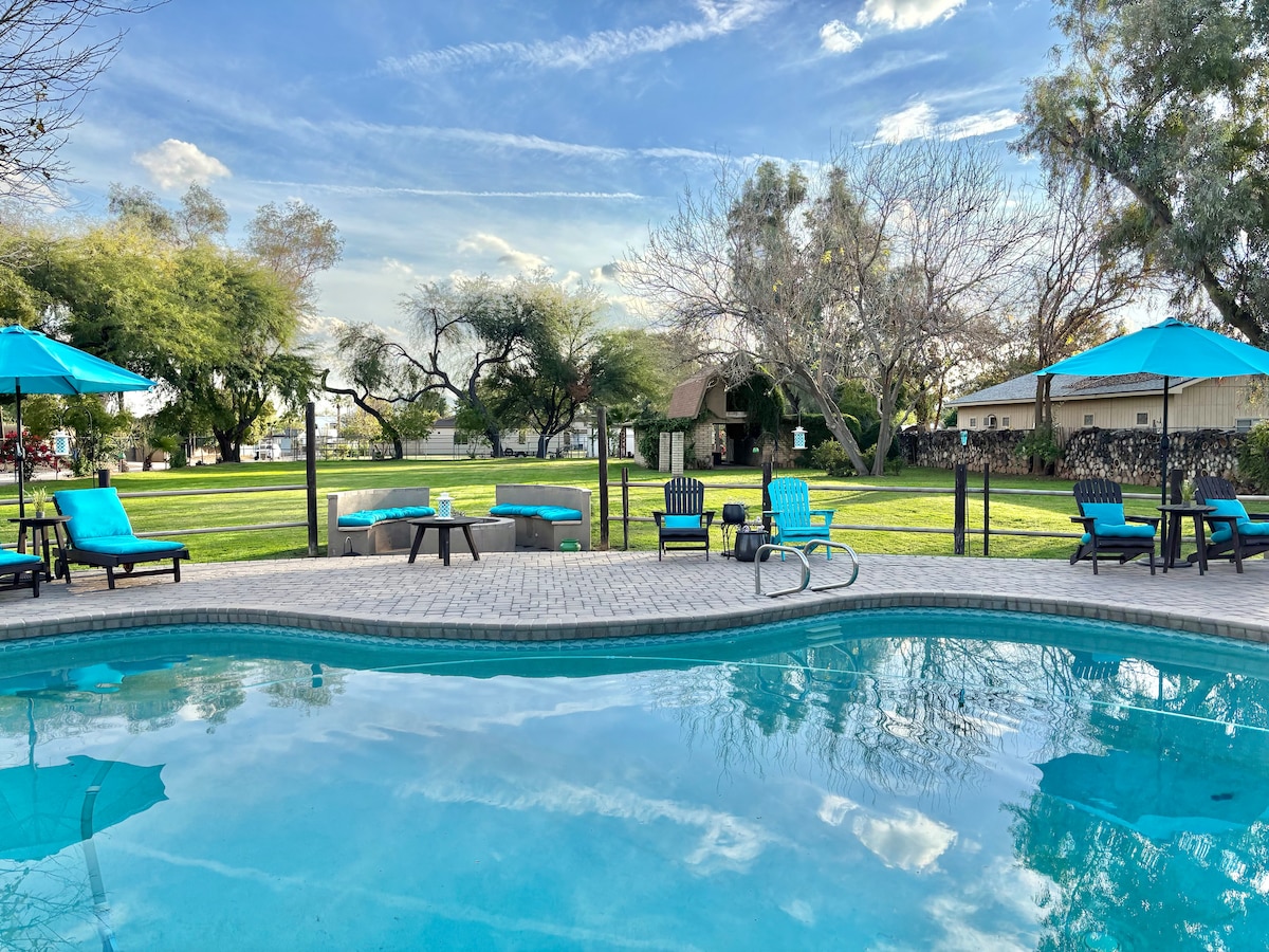 Welcome to The Hidden Hacienda Scottsdale! A fun, whimsical retreat with cowboy-chic decor, pool, spa, karaoke, and games—perfect for bachelorettes, families, or golf getaways. Sleeps 10 with comfy beds, smart TVs, a pool table and a fully stocked kitchen. Lounge beneath swaying palm trees, practice your swing on the mini putting green, or unwind in your private backyard oasis with cozy seating fire-pit and outdoor tv. Minutes to Kierland Commons, top golf courses, Spring Training and more!