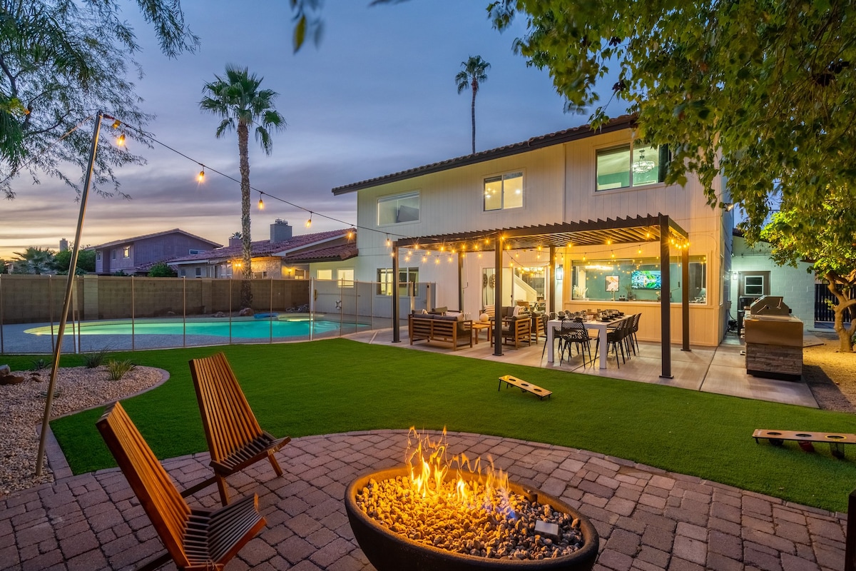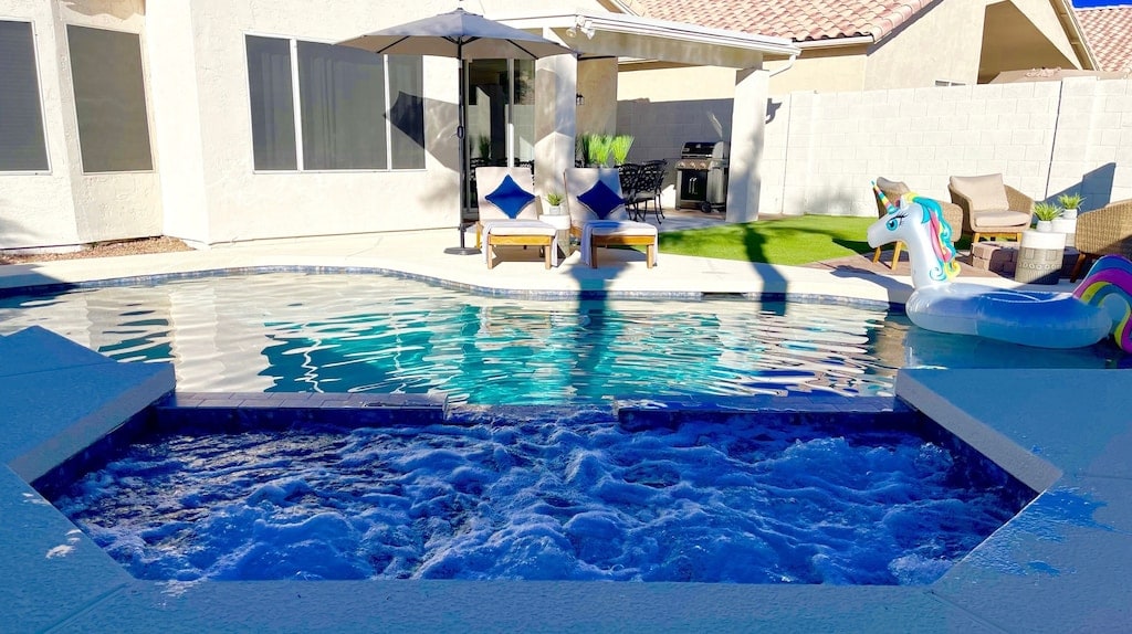 Revolution Retreat features a brand-new heated pool with travertine tile and turf backyard. The home was designed with an open floor plan and a unique style creating the perfect space for your vacation. It is located 3 miles from Old Town Scottsdale and 15 minutes from the airport, so you’re right in the middle of all of the valleys main attractions. The home sleeps up to 10 guests comfortably. (Please note that the pool can be heated for a fee, details below)