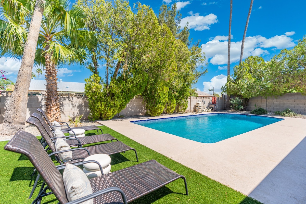 Convenience meets luxury, just 15 minutes from Sky Harbor International Airport & less than 5 minutes from Scottsdale's Entertainment District. With 4 bedrooms, 3 baths, & 2,100 sq ft, its open floor plan exudes spaciousness. Each bedroom boasts Smart TVs, elegant bedding, & plush mattresses. Entertainment options abound, from Ping-Pong in the living room to an 85-inch LED TV in the family room. Outside, enjoy the 6-seater hot tub, pool, fire pit, & lounge area in the fully enclosed backyard.
