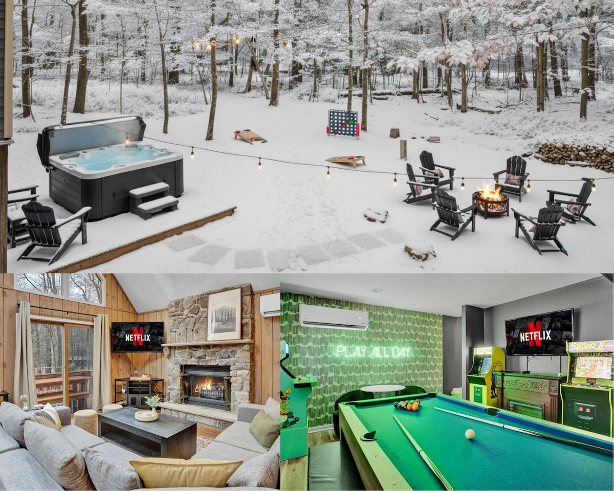 For the perfect Poconos getaway, you deserve a luxurious chalet! ★ 30 min drive to Camelback Ski Resort & Kalahari Resort, Mt. Airy Casino, Great Wolf Lodge ★ 2 min WALK to the lake ★ Pet-friendly ★ Unbeatable HIKING trails ★ 5 bedrooms, 4 bath, 3300 sq ft ★ 1000 sq ft deck: outdoor hot tub, grill, fire pit, PRIVATE sauna, gameroom: billiards, poker, arcade, 2 fireplaces ★ Safe community with tons of amenities ★ Exclusive discounts toward luxury add-ons!