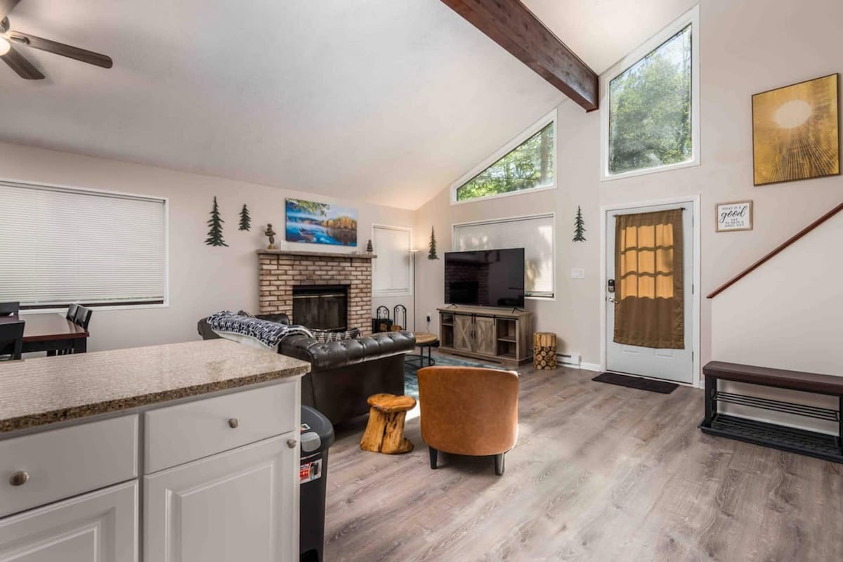 To make your holiday stay even more memorable, the home is decorated for the season with festive accents and a beautifully styled Christmas tree. Escape to this cozy A-frame chalet in Big Bass Lake, perfect for snowy retreats. Warm up in the private barrel sauna, unwind by indoor fireplaces, or enjoy the game room with air hockey, foosball, and 75" Smart TV. Relax by the firepit under twinkle lights, or visit the indoor community pool just 0.4 miles away.