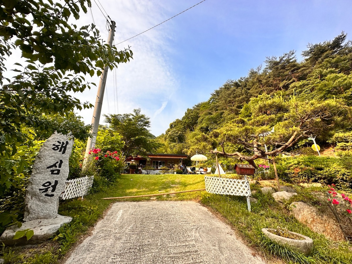 도심에서 벗어나 자연과 함께하는 휴식을 만끽하고 싶은가요? 저희 해심원은 자연과 함께하는 휴식을 선사합니다. 스마트폰을 내려놓고 새가 지저귀는 소리를 들어보신 적이 언제인가요? 일상에서 벗어나 가족 또는 연인, 친구들과 함께 캠핑을 즐겨보세요 저희해심원에서는 몽골텐트를 제공해드리고 있으며 아이들과함께라면 에어바운스와 간이수영장을 제공해드립니다. 또한 무료로 바베큐를 이용하게 해드리고 필요하다면 캠핑파라솔과 캠핑의자 (성인2 아동2) ,프로젝트도 무료로 대여해드립니다. 인원수가 많다면 몽골텐트 외 집 본채도 대여해드립니다 . 개별문의주시면 안내해드리겠습니다. 집 본채 방2개 거실1개이므로 몽골텐트포함 총 10인 숙박 가능 텐트를 소지하고 계시다면 정원에도 텐트 피칭이 가능합니다