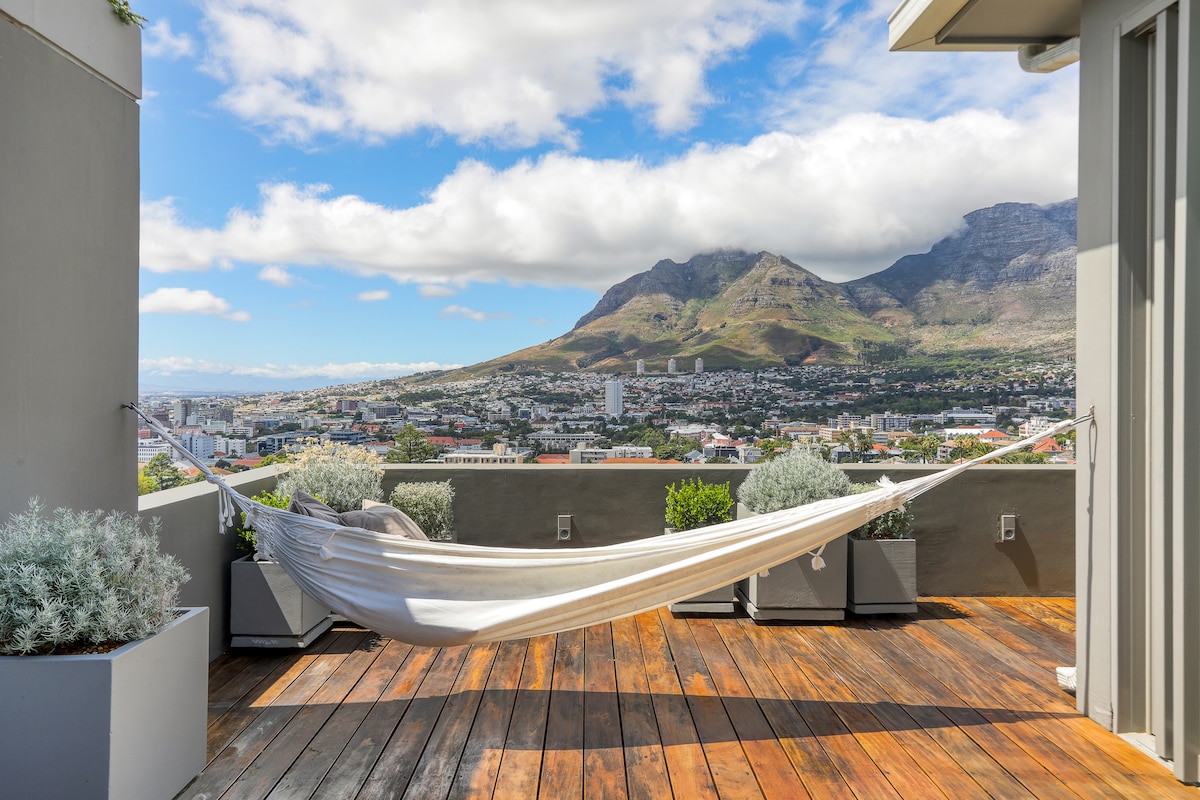 Gaze out on Cape Town from this exclusive retreat high above the city. This quiet cocoon is a place to relax, featuring contemporary furnishings, sliding floor-to-ceiling windows, terrace walkouts, panoramic views of Table Mountain, and a private splash pool. You have an expansive space over two levels to enjoy. Experience the urban buzz or the peace of the great outdoors, both just minutes from the apartment.