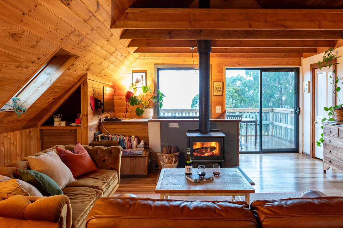 A dreamy and cozy space that’s a true cabin in the woods. Long Tide retreat is the most magical space to rest, reconnect & recharge. Set amongst lush, green open lawns and tall majestic rainforest, the barn is perched a few hundred metres above sea level, giving truly epic ocean views. There’s a calm energy from the open spaces and surrounding forest. A vast expanse of land, sea & sky merge with the earthy and warm tones of the cozy barn style house.
