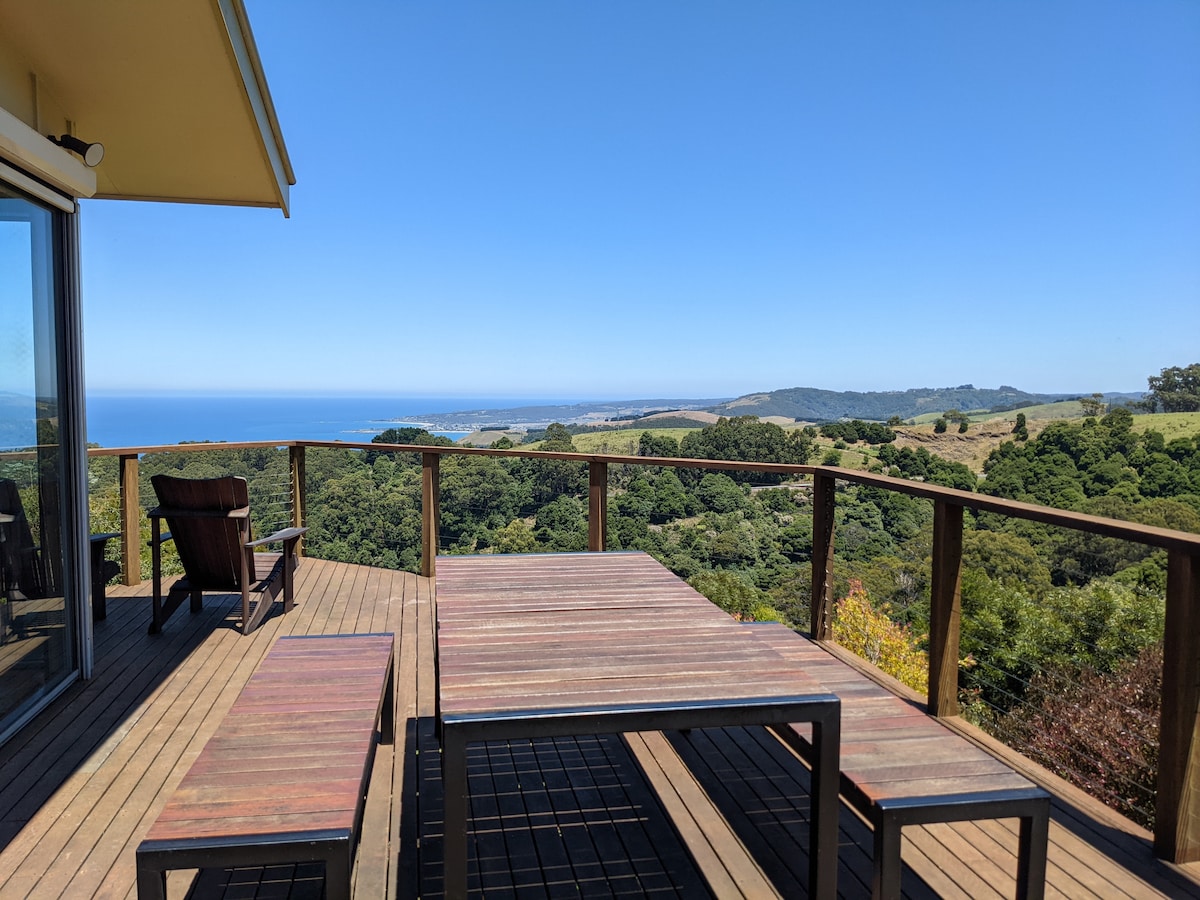 Sunnyside is located just off the Great Ocean Road approximately 15 minutes from Apollo Bay. A fully private and self-contained loft studio offers panoramic views of the Southern Ocean and sits in amongst the Otway rainforest treetops. The property has over 10 acres to explore; an olive grove, an orchard, a mature oak forest and stunning walkways combining both pasture and native surroundings. You may even be lucky enough to meet our resident Koala! A one-of-a-kind experience awaits.