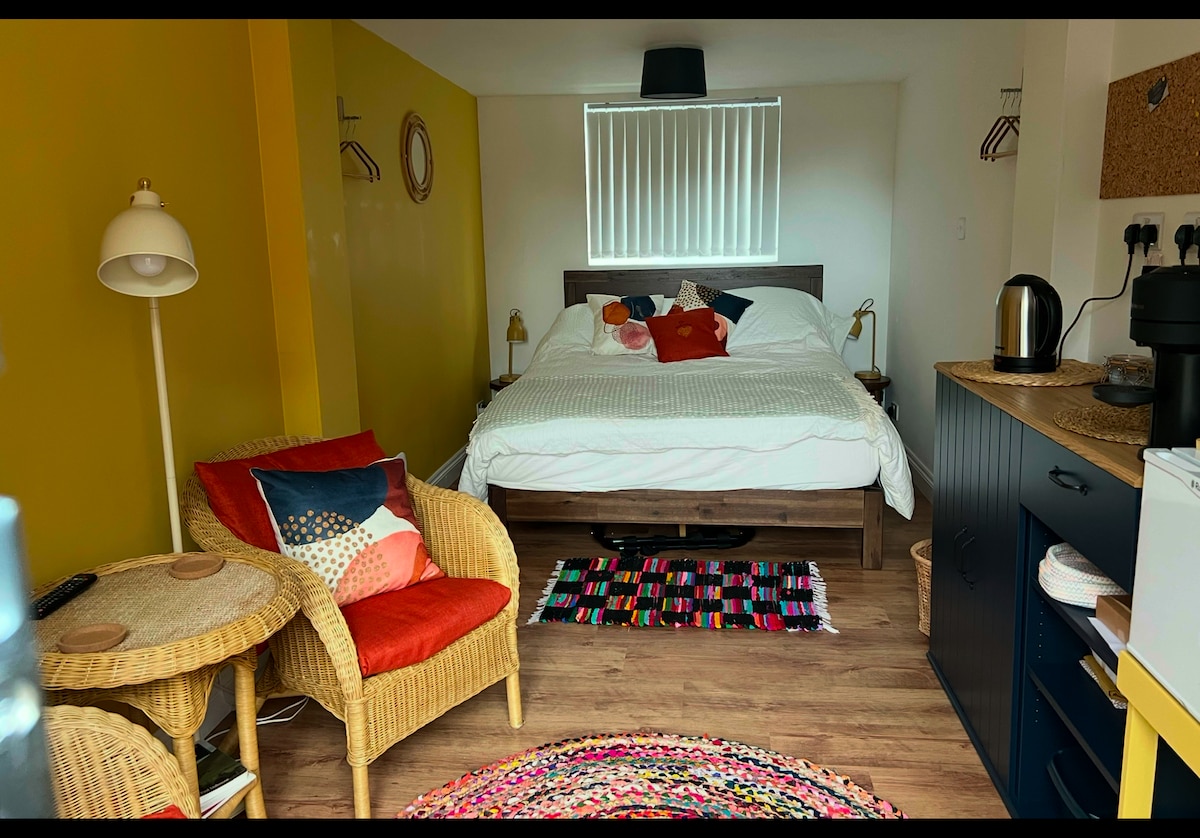 Cosy and functional self contained brand new build studio at end of large garden with sea views. Just a 5-10 minute walk from the nearby beach. Excellent travel links (rail and bus), beautiful cycle routes immediately accessible. This is a purpose built space with very comfy king size bed, private bathroom with shower, toilet and basin. Kitchenette area with sink, fridge, 2 ring hob and microwave with oven and grill. Electric heating, freeview TV. On road parking available.
