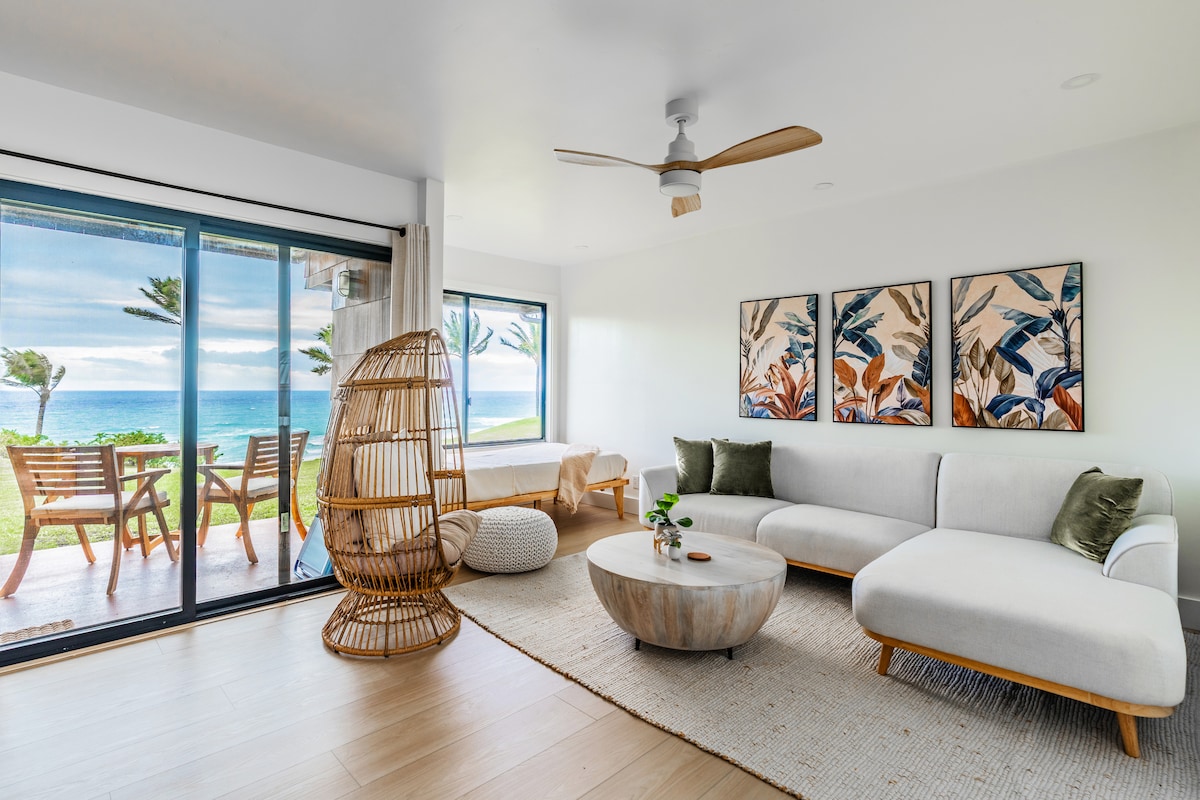 This modern and newly renovated honeymoon beach retreat has breathtaking panoramic ocean and coastline views. Lounge in the daybed while gazing at the sweeping vista from Anini reef to Kilauea Lighthouse. Some have said "it feels like being on a ship at sea" as they witness whales breaching in the ocean and waves peeling on the reef from this magical location. A rare penthouse unit with high ceilings, views from every room, even the famous Bali Hai from the deck. Truly a couple's dream!