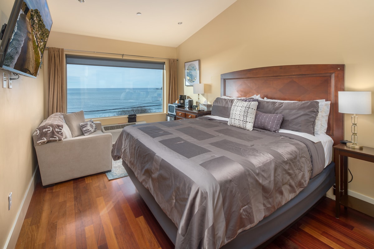 The oceanfront king spa suite is perfectly set up for a couple or small family. Walk out on your own private patio and breathe in the fresh ocean air. Relax by the fire or in the jetted tub. Cook in your full kitchen or enjoy local take-out on the patio. The sofa folds out to a twin bed. Rooms vary in layout and will be assigned based on availability. All rooms are accessible by stairs; there is no elevator on site.