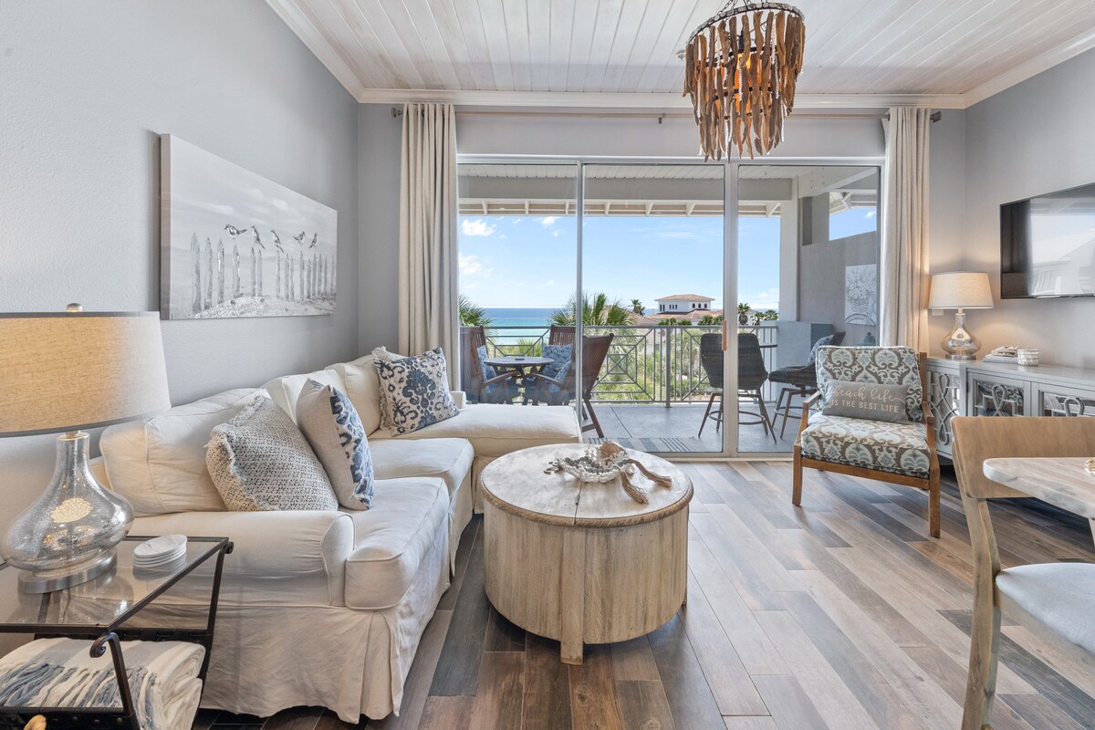 Serenity at Seamist 9 has private beach access and is one of 12 units privately owned in a quiet area on 30-A. Experience a peaceful beach vacation in this exquisite Gulf-front condo. You will be greeted by breathtaking views that match the beautiful turquoise accents in the home. Head out to your private balcony to get a closer look at the brilliant, blue-green waters of the Gulf. Grab your favorite drink and take a seat on the high top swivel chairs. The perfect place to watch the dolphins