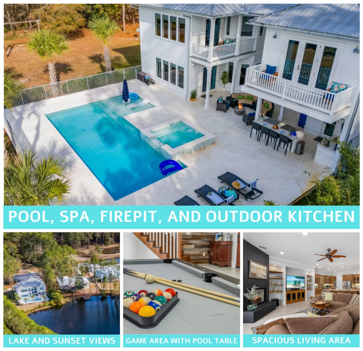 PRIME WATERCOLOR LOCATION! WALK OUT to Camp WaterColor playing field, pools, water slides, lazy river, playground, basketball court, and just steps from WaterColor's generous trail system! 6-seater LSV/golf cart, 4 bikes and WaterColor amenity passes INCLUDED complimentary with your stay! Beautiful home featuring 4-beds EACH with an en-suite bathroom (including 3 Kings and multiple sets of bunks!), fire pit, BBQ grill, 2 porches (1-screened-in) overlooking the field, & outdoor dining table!