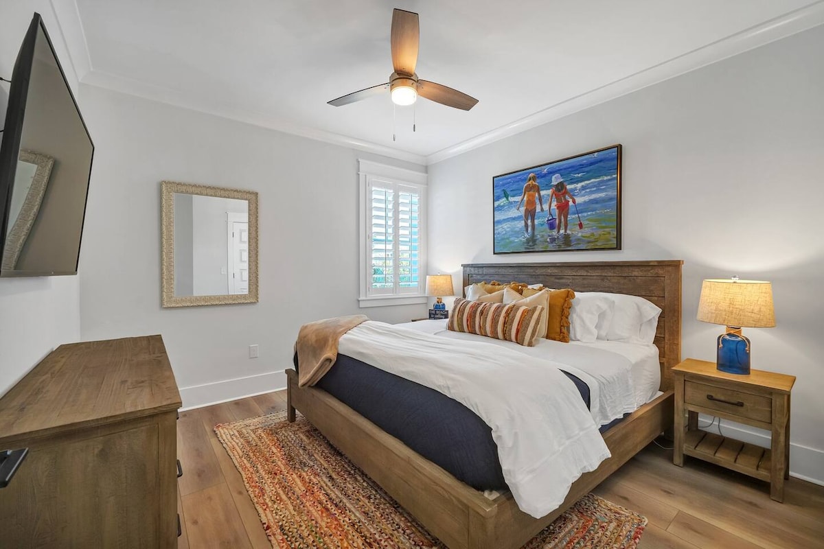 Small in stature but grand in design, this 30A beach house will wow you. Access to neighborhood pool, gym, & the beautiful white sand beaches a few blocks away. Small Waves is set in the Blue Mountain Beach area, which is well-known for its charm, its restaurants, & its famous ice cream shop. We have an EV car charger for electric cars (no extra fee) plus access to an electric golf cart (extra fee). Bedroom has a king size bed & twin bed & there are also 2 twin beds upstairs.