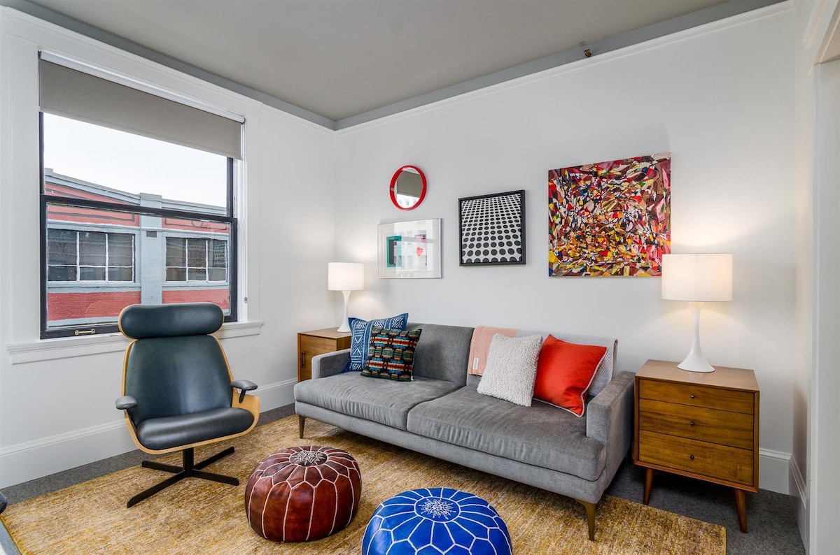 The Deluxe King Suite is a spacious room with a wall of windows and a full sitting area - including a full couch. The room includes a mini-fridge, a walnut dry bar, free wifi, and access to a communal kitchen located down the hall. It has its own private bathroom with shower. While we allow pets in some rooms, this suite is not pet friendly.