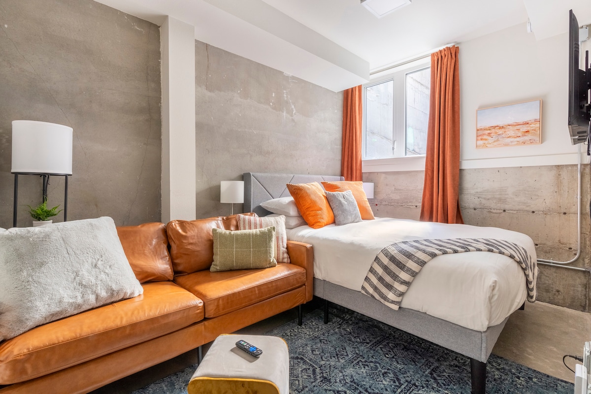 An upscale executive King bed suite with 700 sq' and an amazing downtown location. We are a 1/2 block walk to Pike Place Market and a 2 minute walk to the Seattle Waterfront & Ferris Wheel. The suite has a gorgeous view of the industrial waterfront from the TOP floor! You can watch the ferries go in and out. Air conditioning, full kitchen, 1G Internet, workspace, & Starbucks included. No Cleaning Fee!!! Advanced COVID cleaning including UV - C disinfectant and medical grade HEPA air filtration.