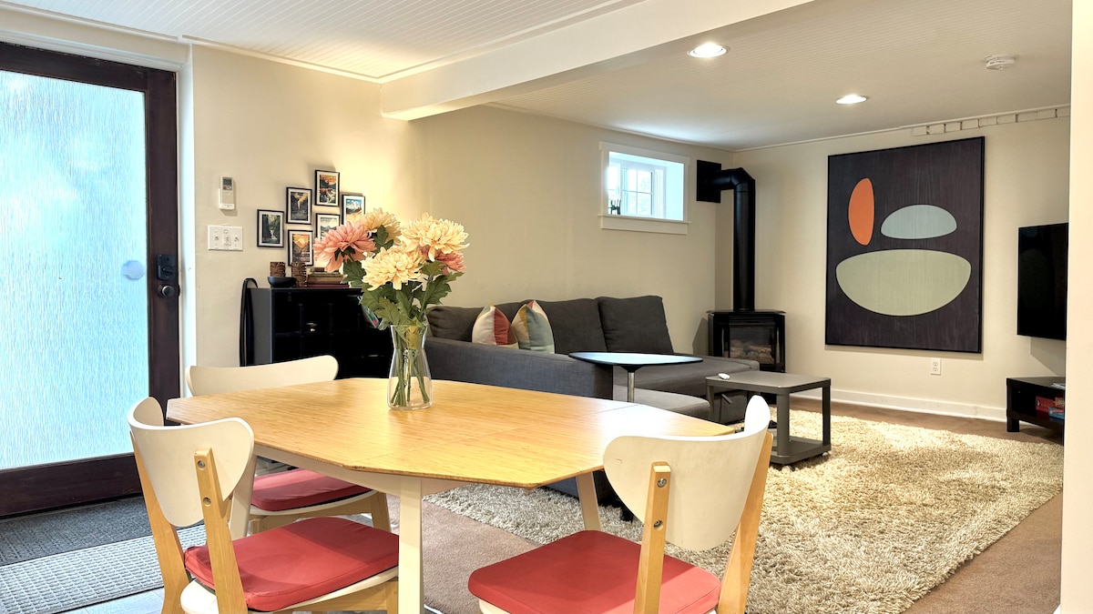 Relax in our cozy garden-level suite with a private entrance, perfect for up to 4 guests. Features a queen bed with quality linens, fully equipped kitchen, claw-foot tub, fireplace, Wi-Fi, A/C, washer/dryer, and free street parking. Enjoy complimentary toiletries, coffee, tea, and snacks. We live upstairs, but the suite is fully private and all yours. Located in quiet Maple Leaf, just minutes from the Northgate light rail, and I-5 for quick access to downtown. Book your stay and feel at home!