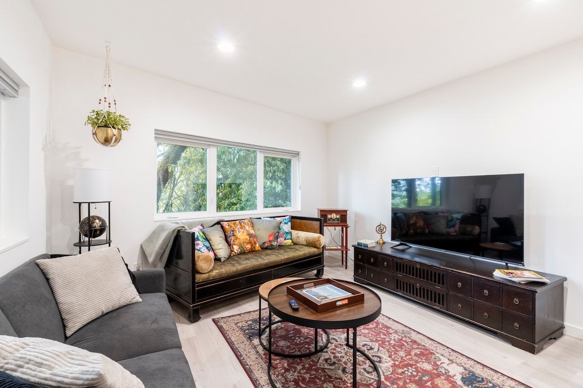 We have a compact but spacious-feeling 1 bedroom apartment that accommodates 4 guests with the addition of a full-size sleeper sofa in the living room. Open floor plan with the kitchen and living room. It offers a lot of windows and daylight with skylights in the kitchen and shower. We have a lovely west facing balcony that overlooks the the garden and provides territorial sunset views. It offers Northwest/Scandinavian modern design and a clean feel.