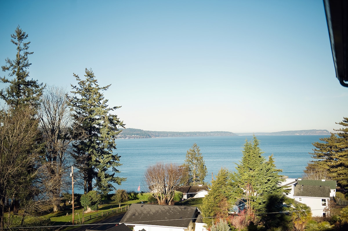 Our studio apartment has a private entrance and a private Juliet balcony to enjoy stunning views of Puget Sound. Sleep in comfort on a Tempurpedic bed with adjustable head and foot lift. Additional sofa bed for extra guests. All necessities provided. Private indoor pool with views out to Puget Sound. Many attractions are within a 10 minute walk, including Mukilteo beach, the ferry terminal, the Sounder train to downtown Seattle or Mukilteo town.