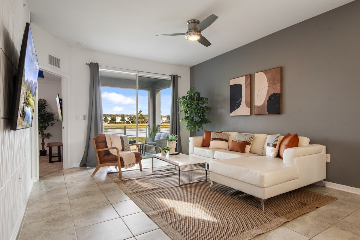 Brand New Bohemian & Chic 2bedroom /2bath fully equipped apartment . Pool View for up to 6 guests. Located in the family friendly Storey Lake Resort minutes from Disney. The open floor plan blends kitchen, dining, living room with 70"TV & Relax Room. Master suite has a King bed & 65"TV. Second bedroom has a Queen & Twin bed w/ Smart TV. Close to outlet malls & retail stores. FREE Water Park & Amenities: POOLS, KIDS SPLASH ZONE, WATER SLIDES, LAZY RIVER, GYM, TIKI-BAR, ICE CREAM SHOP & More.