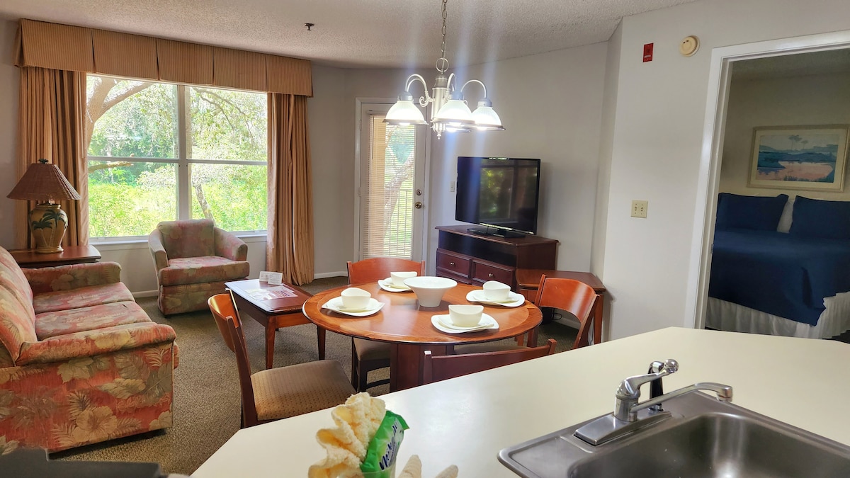 1 milha do discovery cove e sea world!Apartamento de um quarto aconchegante para famílias de um casal e até 2 crianças , com móveis e decoração planejados em condomínio calmo, arborizado, com piscina. O condomínio está localizado na International Dr., e 15 minutos dos parques da Disney e da Universal Studios, fica perto de shoppings, supermercados e outlets. Não aceitamos mais que 4 pessoas. Oferecemos transporte gratuito para os parques universal e Disney.