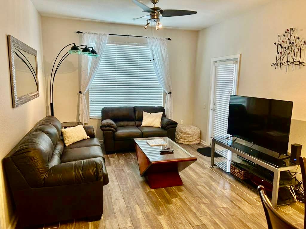 Welcome to our stylish oasis in Kissimmee, which seamlessly blends sophistication with a laid-back vibe. Your stay begins in a professionally cleaned apartment for your full enjoyment. Discover resort-style amenities – a sparkling pool, a fitness center, and hammocks, offering the luxuries of a five-star retreat. Conveniently located with in walking distance of theme parks, restaurants, and shopping. Book now. We can't wait to host you in our little slice of paradise!