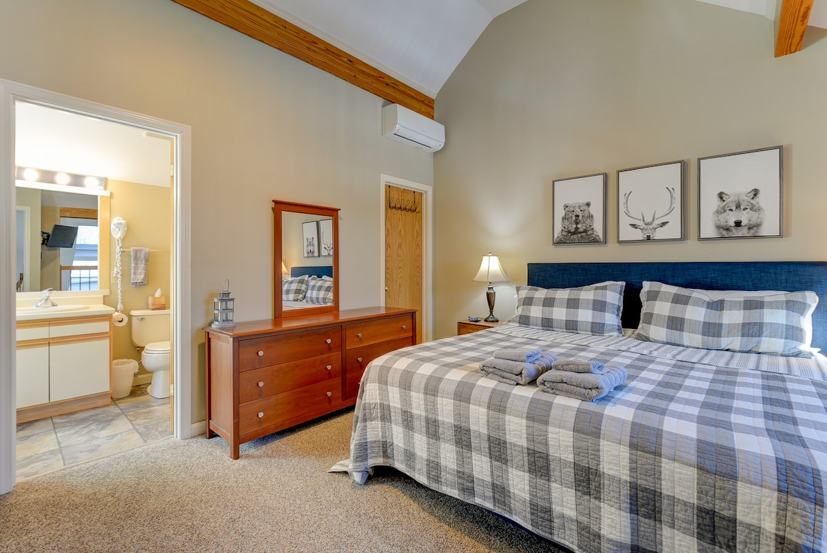 • Perfect for small families or couples, our signature A-Frame cabin features a modern interior gas burning fireplace, soaring ceilings, huge windows, stylish interiors, and all the comforts of home. • This cozy 1,100 square foot space comfortably accommodates up to four guests in two bedrooms (one with a King-size bed and the other with a Queen-size bed) and a shared bathroom. • 7 minute drive to downtown Freeport. • Proud to be ranked in the top 1% and voted Guest Favorite!