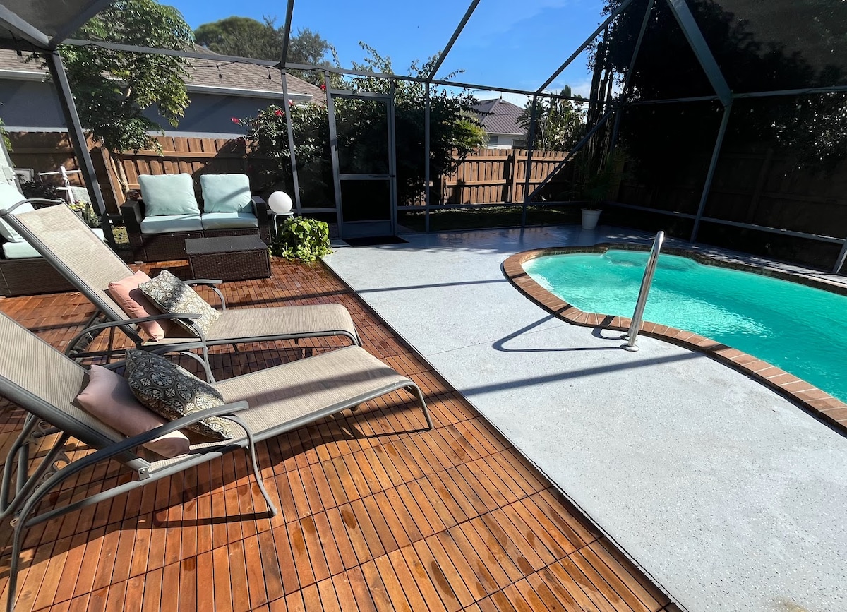 ~Tropical 3Br/2Ba~Heated/Cooled Pool Home Located just minutes from the Indian River, Sebastian Inlet, boat launches, beaches, restaurants, tiki bars, shopping, and skydiving! The home features a resort style outdoor space with pool, pergola, bar and grill area, putting green, and a large open space for games. Newly furnished with 2 king beds/1 queen/1 futon couch. We offer a fully equipped kitchen with coffee bar and starter basket. Don't forget the boat; secured boat parking on property!