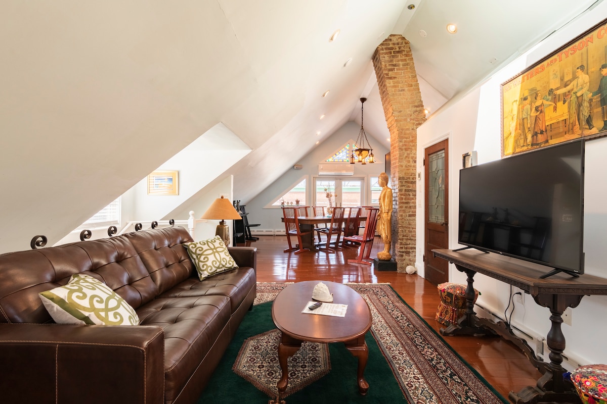 Bright, modern & stylish original exposed brick-wall loft in downtown Newport/ Broadway area. Newly renovated with open floor plan, designer bath/ kitchen and all new appliances. High ceilings, new wood floors , 9 extra large windows, modern design. @ 1650 sq. ft (avg. Hampton inn room is @350 sq. ft) 1 private bedroom with queen bed, 1 Murphy bed (dble), 1 Bunk bed. One of three units available in the same building: airbnb.com/h/gritspearl airbnb.com/h/gritsloft