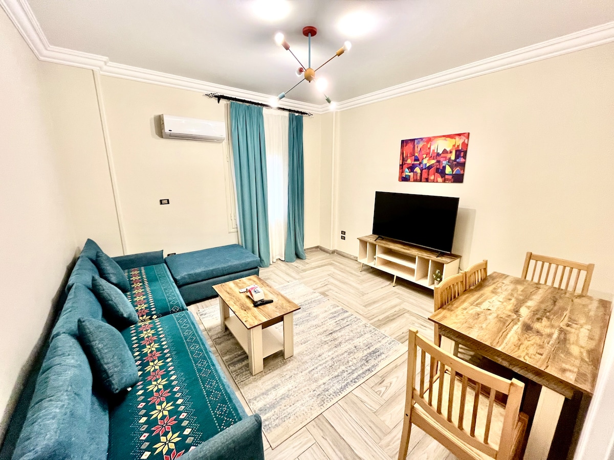 An ENTIRE APARTMENT with a back garden situated in a beautiful and green area in a peacefully integrated community fulfilling all residents' needs. Rooms are newly furnished, air conditioned, smart T.V. and all amenities you might need, super CLEAN and QUIET. The apartment is 25 minutes from Cairo intInternational Airport. coffee shops, restaurants, supermarkets, and pharmacies are all nearby. Hotel standard quality with home like comfort offered with a REASONABLE PRICED.