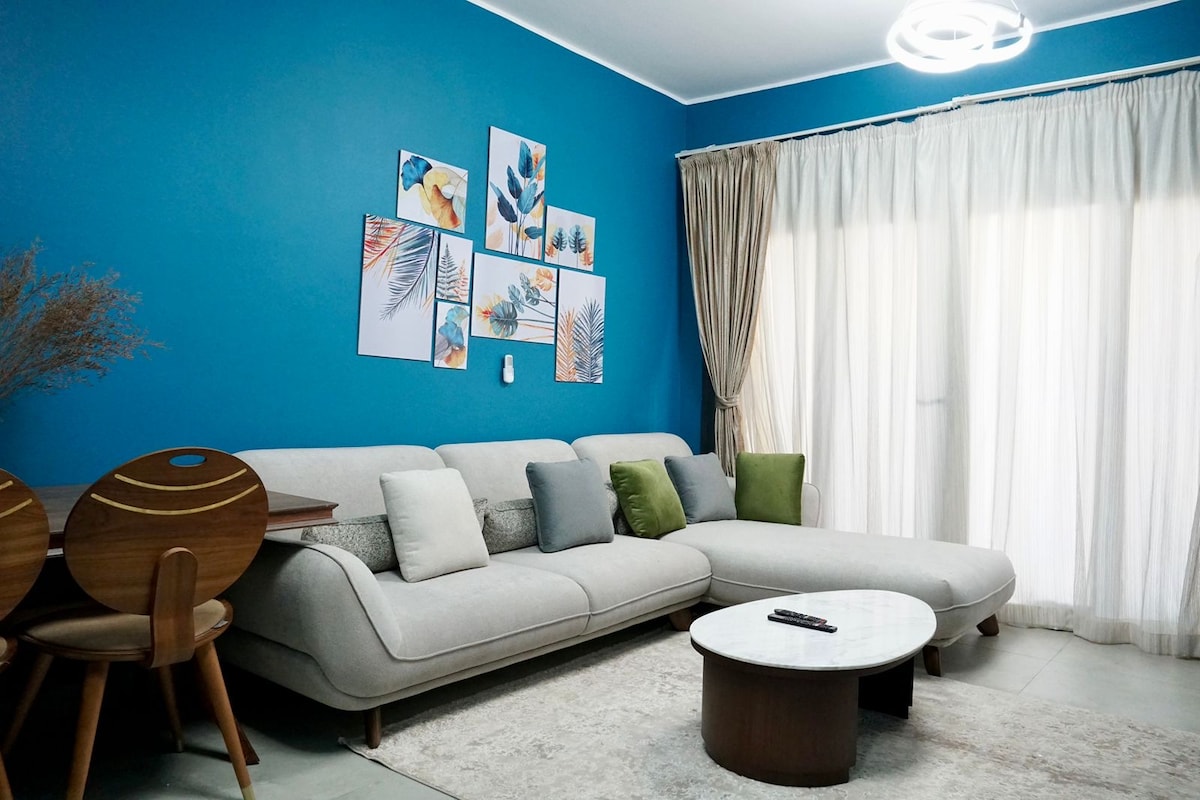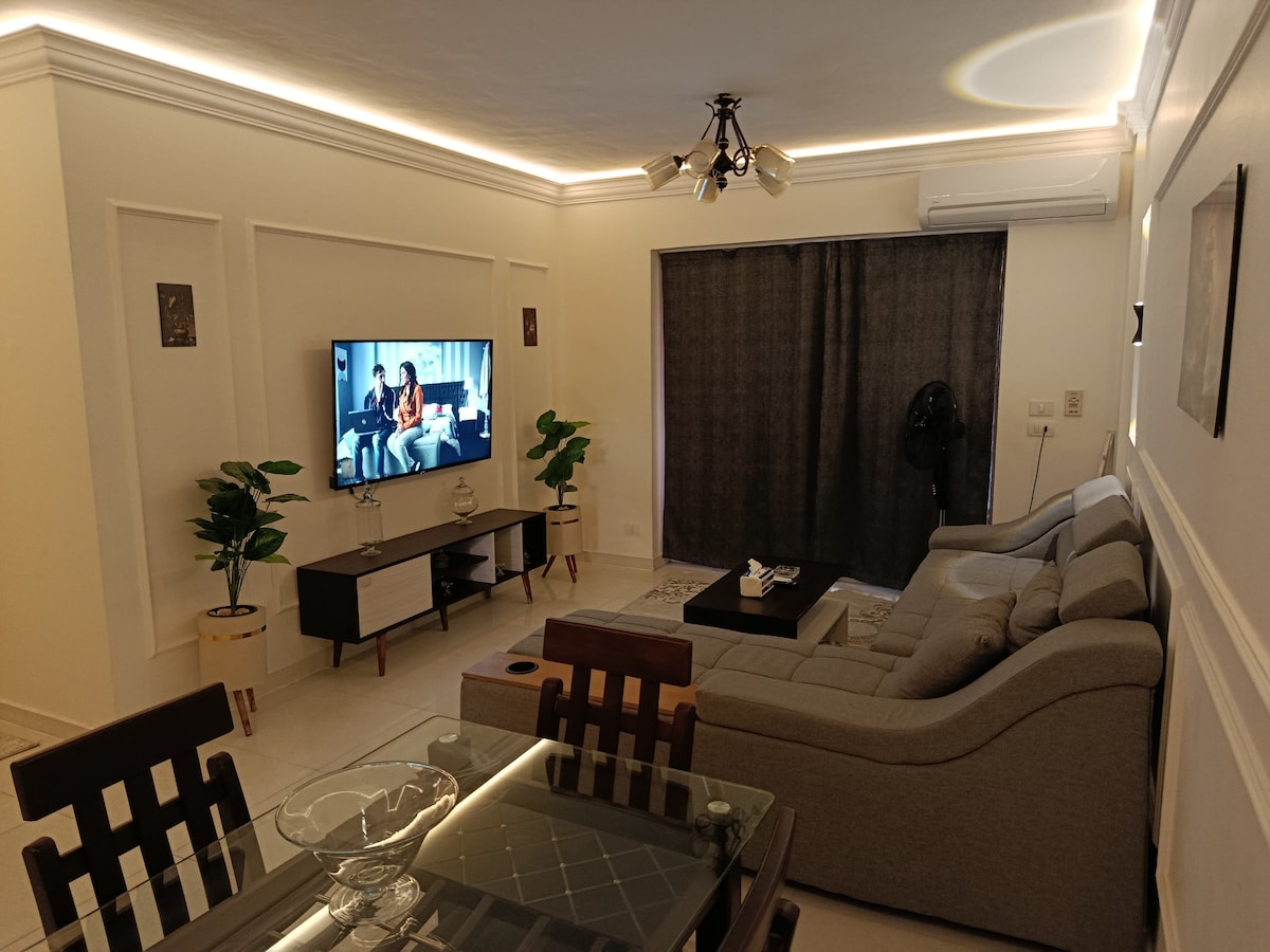 Welcome to my lovely Charming Luxury apartment! My Apartment located in Luxury safe Compound with very good wide Garden and Kids Area. Enjoy modern elegance 2 Bedroom , complete AC, and comfort. Stylish living area, fully equipped kitchen. You'll love the stylish décor and cozy atmosphere, which makes it the perfect home away from home. *High-speed internet. *10 mins to City Center Almaza Mall *15 mins Cairo Festival Mall *15 mins to Airport Book now for a delightful stay!