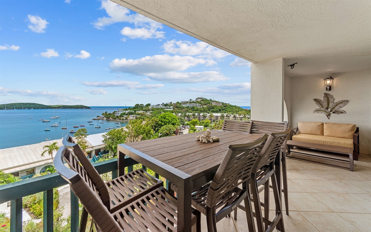 Two story oceanfront VILLA with PRIME views of the marina and St. John at SAPPHIRE BEACH RESORT. This 1200 square ft. newly furnished, two story villa sleeps 6. It offers robes, outdoor couch and dining, grill, cable, upstairs and downstairs TV, two bathrooms, washer, dishwasher, and wifi. Relax in the large upstairs bedroom with cathedral wood planked ceilings and plush KING SIZE BED or enjoy lounging outside at one of TWO BALCONIES that offer the best views at Sapphire Beach Resort!