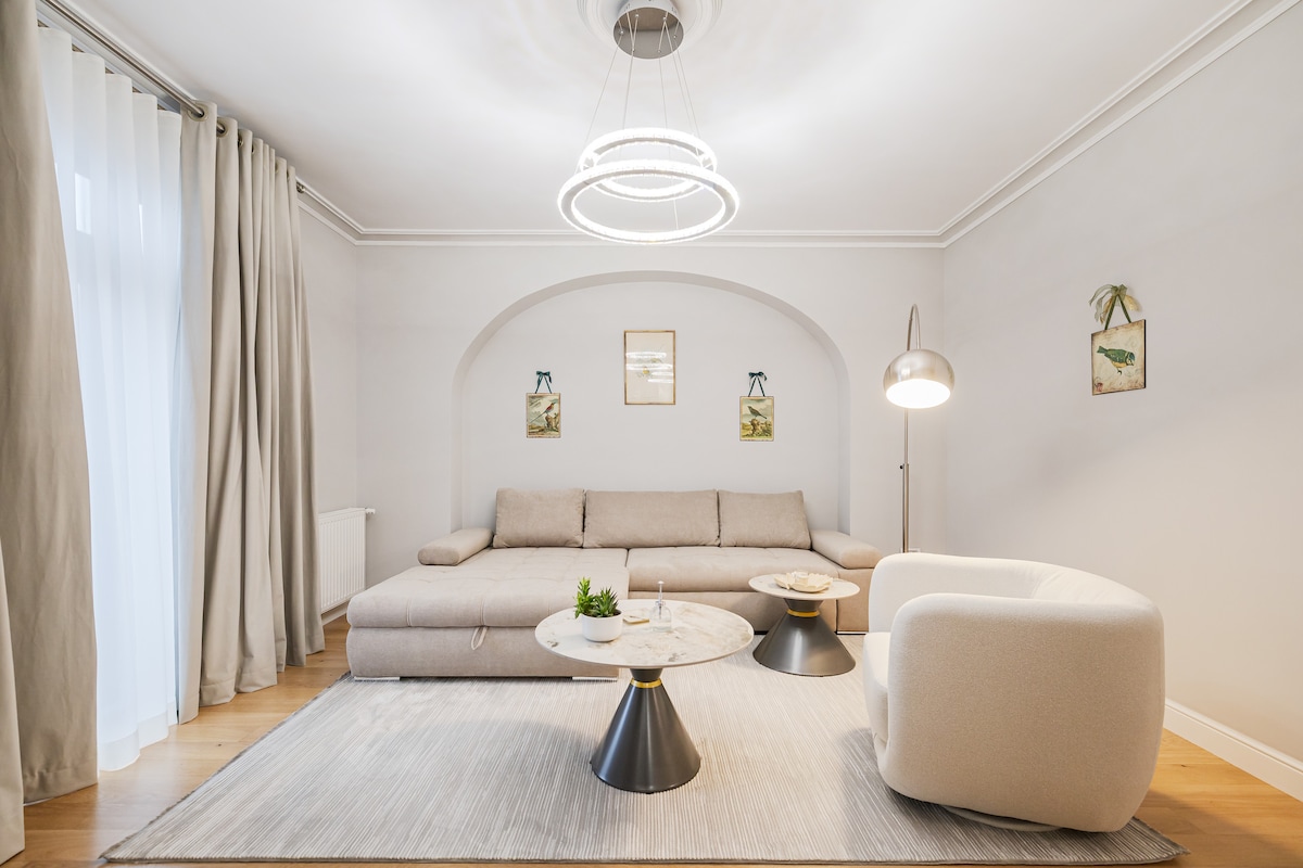 Welcome to our modern, designer-renovated apartment set in a beautifully restored historic building on the famous Dacia boulevard, steps away from Piața Romană. Featuring a bright living room, 2 bedrooms, 2 bathrooms, a fully equipped kitchen, a balcony, premium finishes and top-notch amenities, we can comfortably host up to 6 guests, with 2 queen beds and an extensible sofa bed. Ideal for couples, families and business travelers—stylish, comfortable and ideally located in the heart of the city.