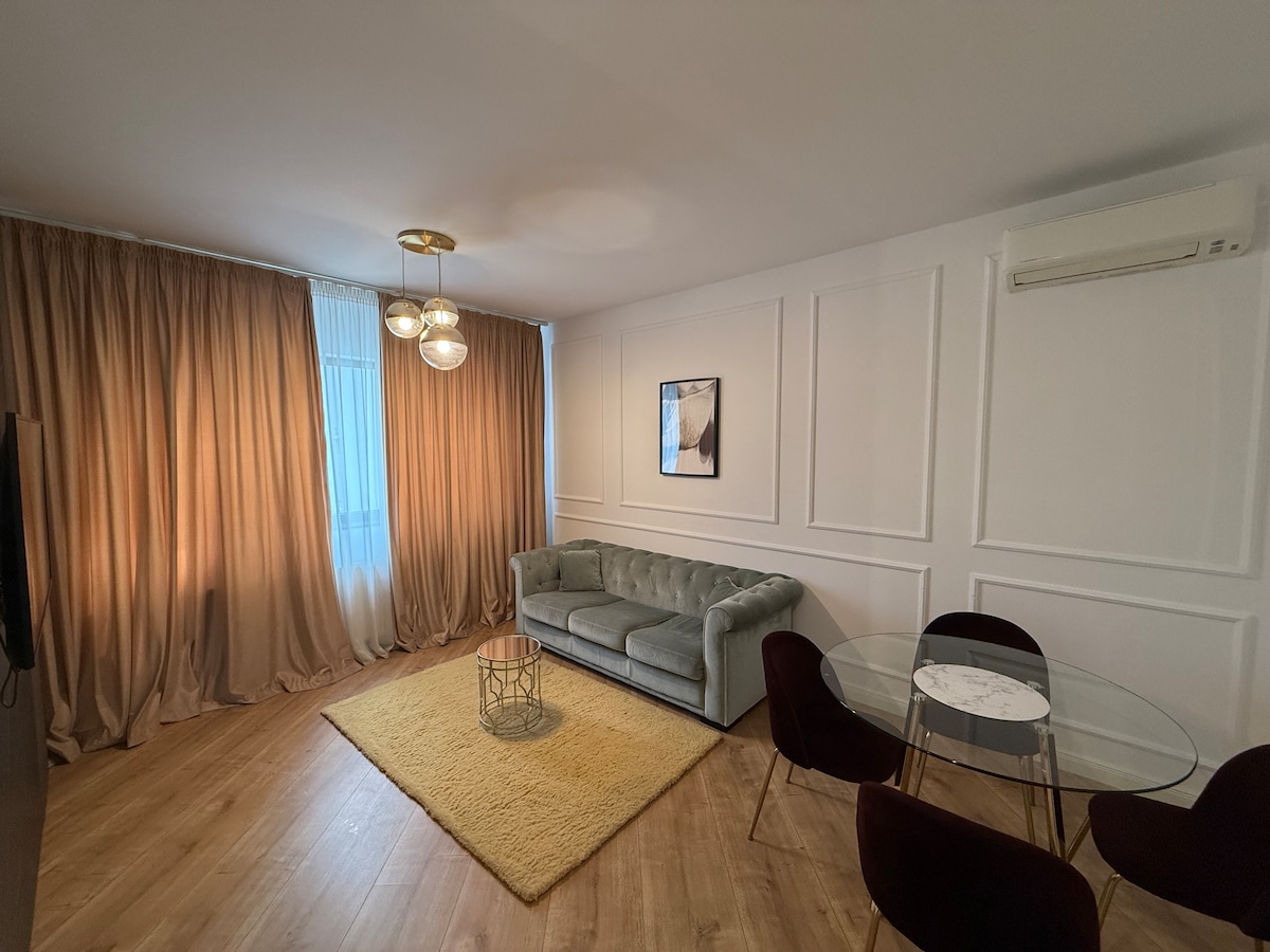 Aceasta locuință călduroasă și luminoasă este situată într-un complex rezidențial nou și modern ce oferă pază și recepție permanentă. Locul de parcare în subteranul imobilului. Spațiul: - un dormitor cu pat dublu - living cu canapea extensibila - Netflix & Wi-Fi - bucatarie cu aragaz, cuptor, frigider, mașina de spălat vase, mașina de spălat haine, expresor - o baie cu cadă și uscător de păr - aer condiționat în fiecare cameră - fier și masă de călcat -bucătăria este utilată comple