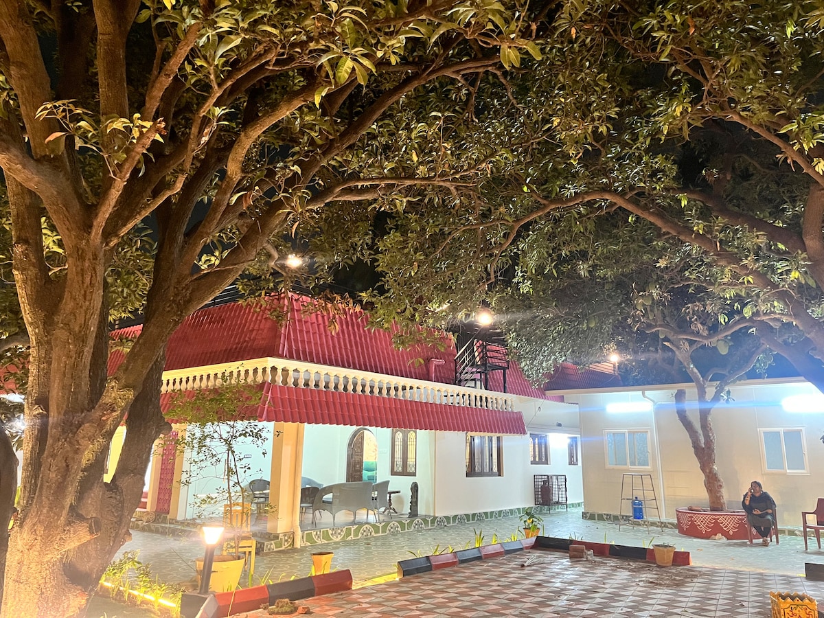 Escape to a peaceful guava farm retreat where mornings begin with peacock calls and days unfold in your private pool. Savour farm-fresh guavas right from the orchard, whip up light meals in the fully equipped kitchenette, and unwind under the stars with a film at the outdoor movie theatre by the pool. Reconnect with nature, relax in style, and make lasting memories in this sanctuary near Hyderabad.