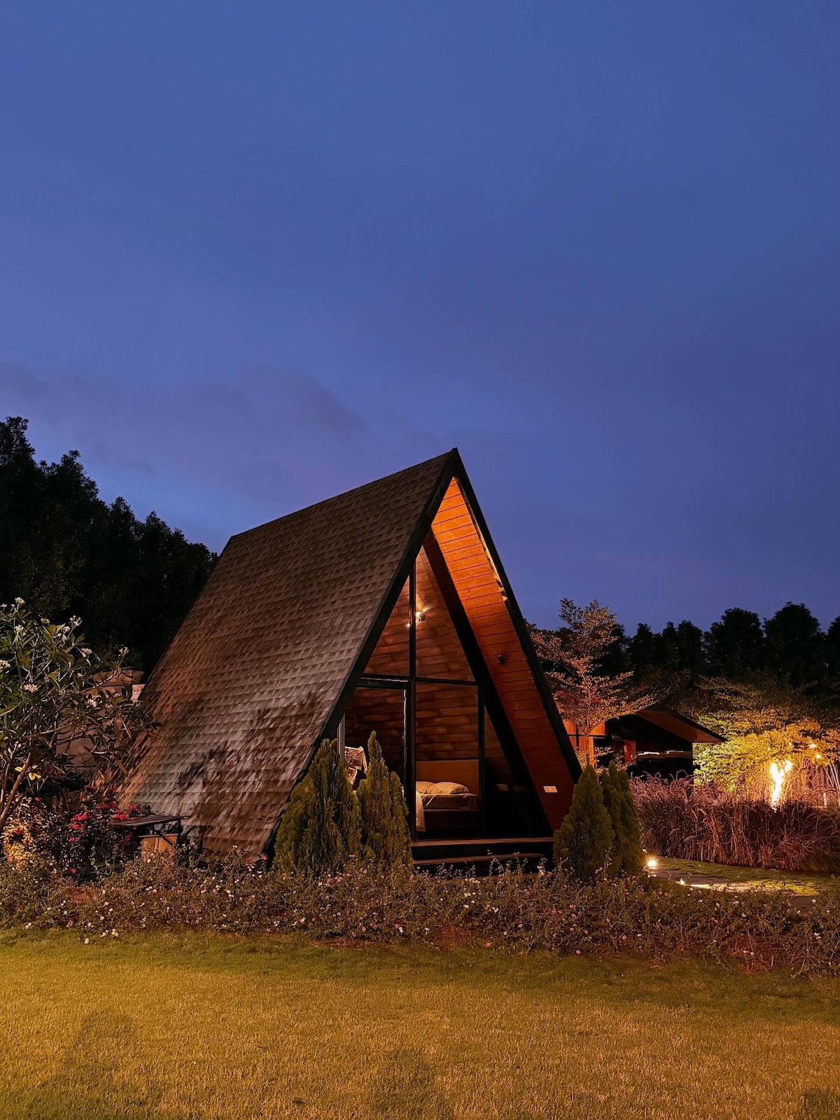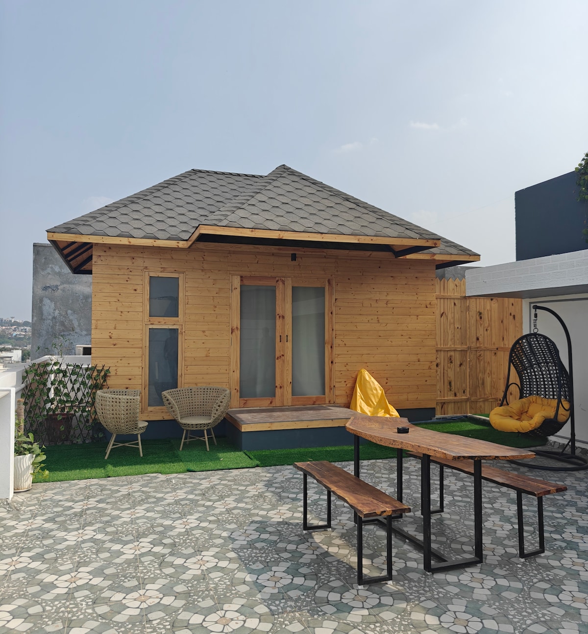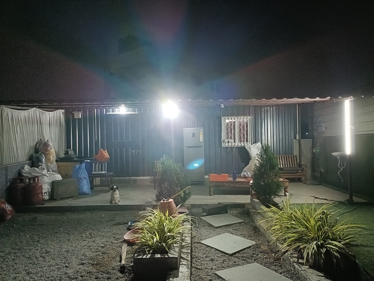 This stylish place to stay is perfect for party gatherings, wooden cottages experience with ample open space where u can sleep under the stars, enough space for two adults and two kids , good for group parties upto 6 people