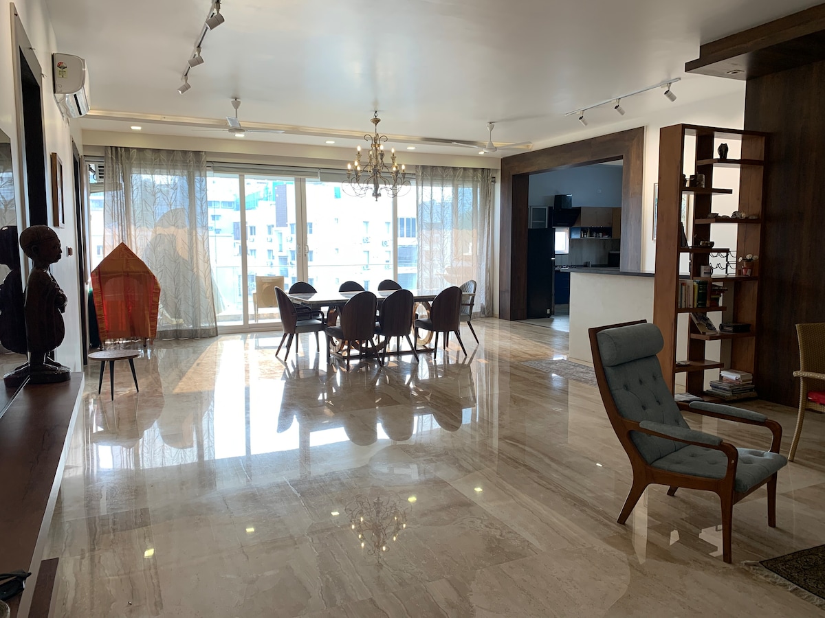 Amenities: AC Living room with 65-inch smart TV Dining area 4 AC bedrooms with attached washrooms Daily house keeping Foosball table Washing machine Equipped kitchen Microwave, Kettle, Rice cooker, Water purifier Refrigerator 4 geysers Free car parking Cleaning - Once everyday Forget your worries in this spacious and serene space. Discover a peaceful escape in the heart of the city, close to the best, dining, and entertainment. Our home stay provides everything you need for a comfortable stay.