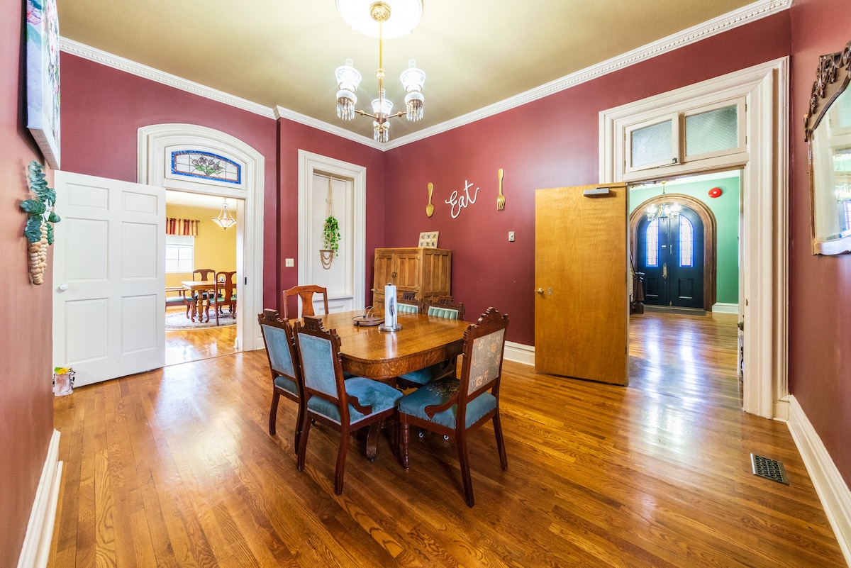 You are going to fall in love with this beautiful restored 1900 two-story Victorian house in the heart of Sedalia. This stunner has 2 sitting rooms, a fully stocked kitchen to cook your own gourmet meals, a dining room that seats 6, 3 bedrooms with 2 queen and 2 twin beds, 2 full baths with one on each floor, utility room with washer and dryer, Wi-Fi, and a relaxing front porch. Located just five blocks from the Katy Trail and downtown and 1.5 miles from the State Fair and Community College.