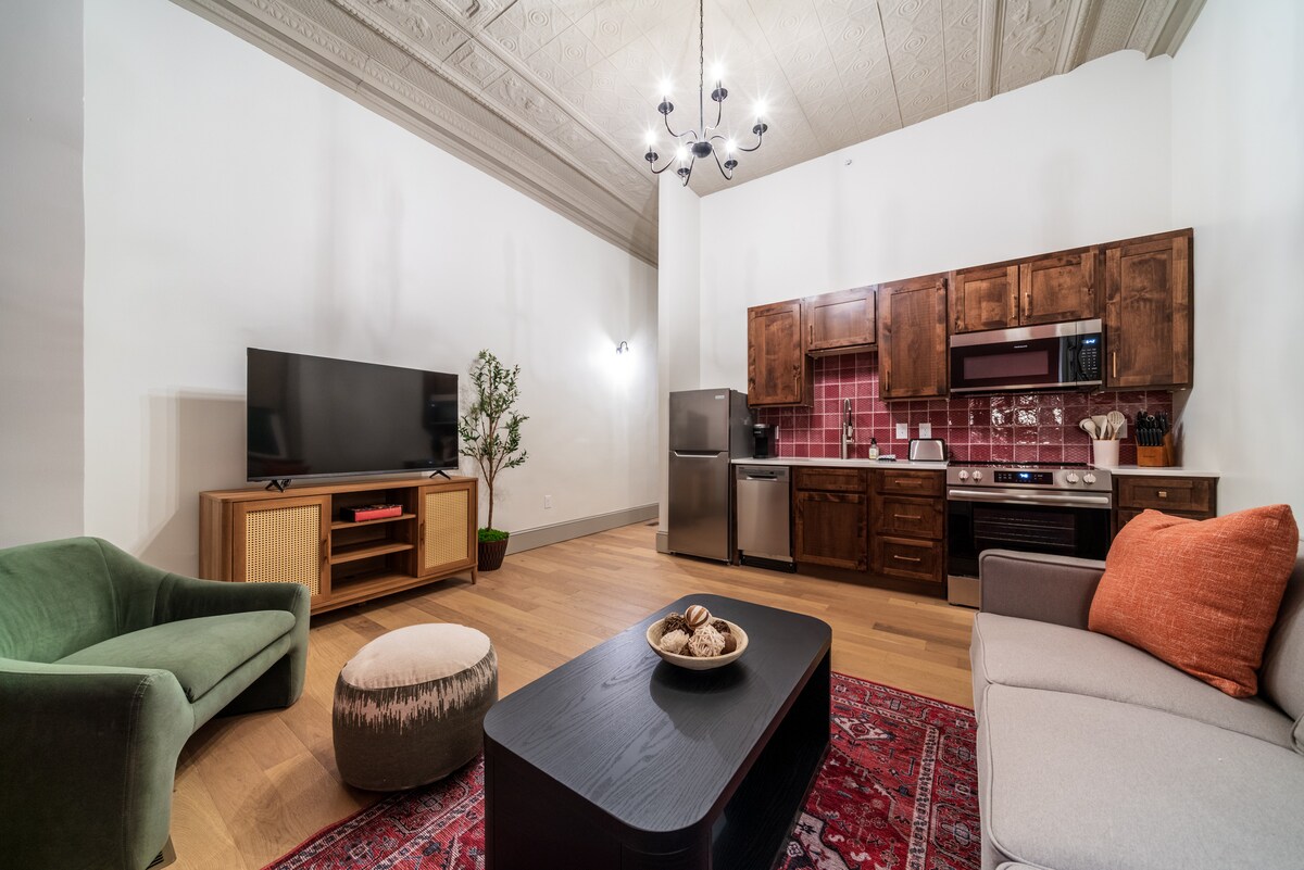 Luxury 1 bed, 1 bath on the 2nd floor with keyless entry, fast Wi-Fi, a smart TV, blackout shades, and a fully equipped kitchen with custom cabinetry and quartz countertops. Located just steps away from wedding venues, bars, restaurants, and shopping downtown. The building features a beautiful 2nd floor patio with comfortable seating, indoor bike storage, and washers and dryers.