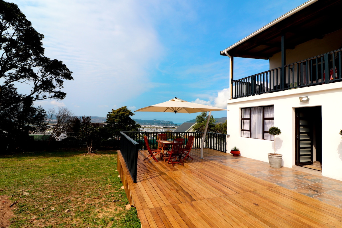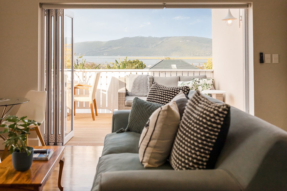 Upmarket and stylish unit, with private deck and a wood fired hot tub. WATER TANKS FOR BACKUP WATER!! Walking distance from Knysna Waterfront, shops and great restaurants. Beautiful lagoon views! Fully equipped kitchen with gas stove, espresso machine, dishwasher, washing machine… King size bed, spacious lounge, bedroom and bathroom and a cozy fireplace. Fast internet, full DSTV, Netflix, dedicated work space. Comfortable outside seating. We regret, no children or infants allowed.