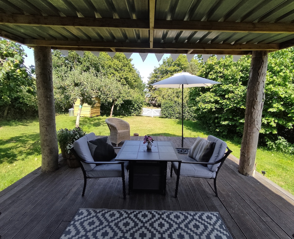 This bespoke timber frame building was specifically designed for the holiday market. Imagine a sumptuous high-end hotel suite glazed on two sides. Then include a well-equipped fitted kitchen, add on an attached covered deck with semi sunken Hot Tub. Place inside a private garden with tended lawn, climbing roses and wildflower area. Throw in a handmade slate alfresco dining set and brick built charcoal grill. Then raise it up to maximise the 180 degrees of uninterrupted country side views.