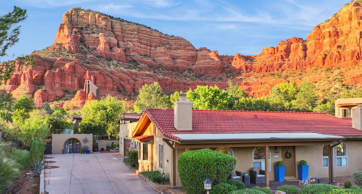 Enjoy majestic views of famous Sedona Red Rocks in the luxury of your own private villa. Steps away from iconic Chapel of the Holy Cross, popular hiking trails. House features mid-century modern aesthetic, 1- KING size , 1 -Sofa bed with 2 baths, 2 spacious living rooms, kitchen, office, outdoor dining space w BBQ. After a day in the desert, just short distance away, head to Downtown Sedona, pursue incredible art galleries and explore local restaurants ! TPT# 21426328/ 1,800 Sq. Ft.