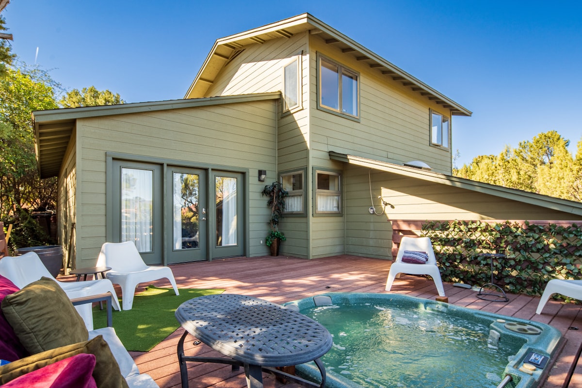 10/10 PERFECT LOCATION with views out nearly every window! Stunning historic home right in the heart of Sedona. 3 bedrooms w/ split floor plan - the 3rd bedroom has a queen with another bed/pullout in the lof. 2000 SF on 1/3 acre with a hot tub, walkable to restaurants, shopping, & located right beside the amazing Tlaquepaque (5 min walk) & the creek! In the middle of everything yet feels very private. Steps from Brewer Hiking Trail. Free Tesla charger. Best Airbnb in Sedona by the AZ Insider.