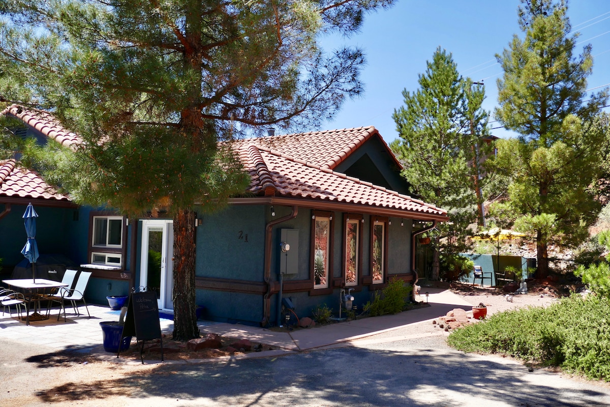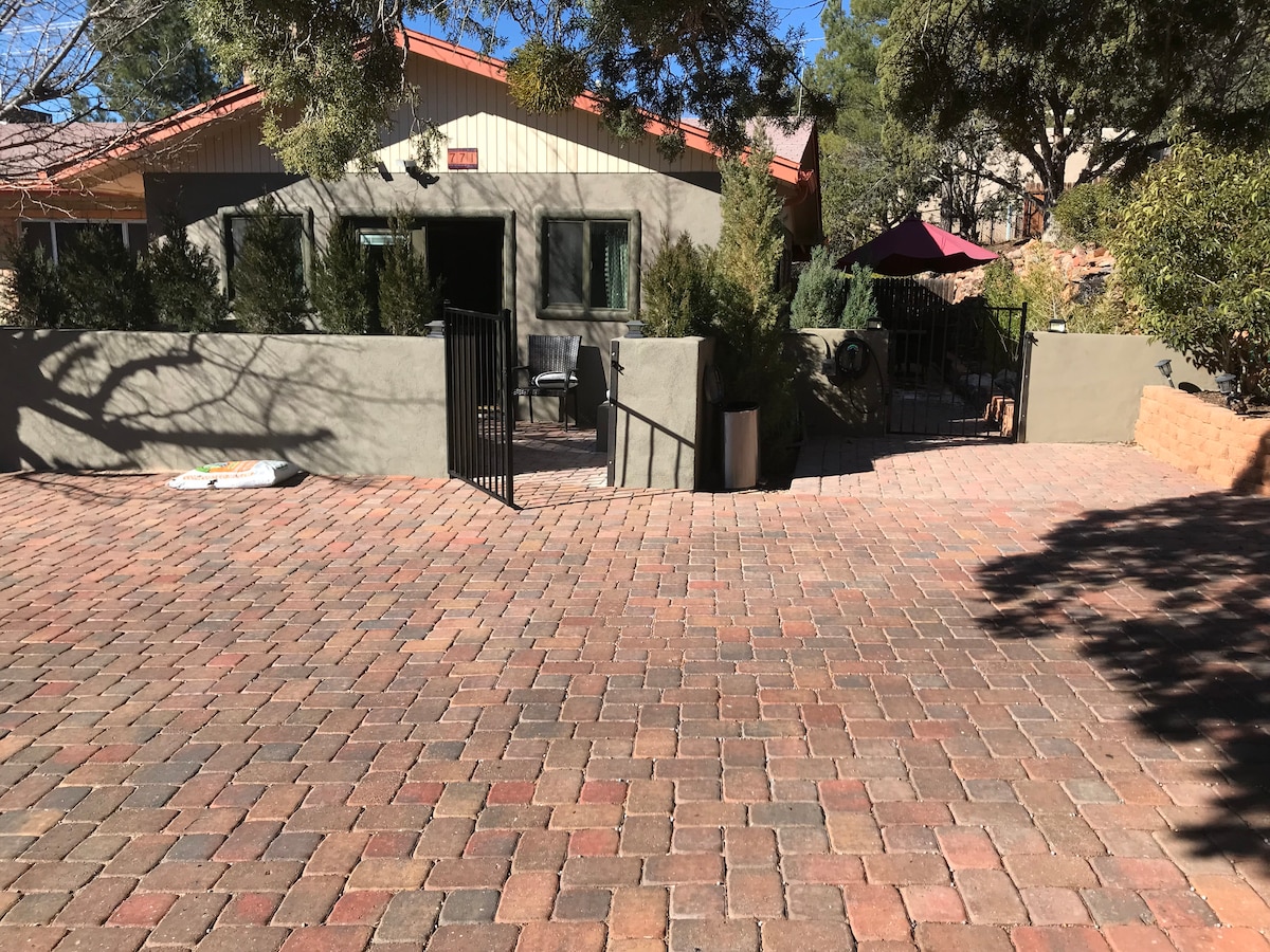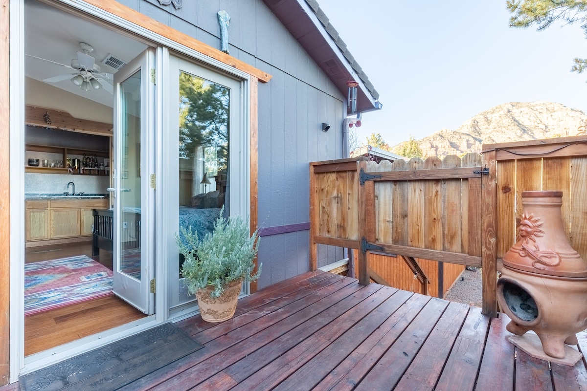 A quiet, bright, spotless studio in the CENTER of Sedona! Walk to trailheads, Sedona Shuttle, restaurants, Posse Grounds events park. King bed and Spa shower gets rave reviews. Fast Wi-Fi, smart TV, washer/dryer, kitchenette, coffee selections, Aveda products. Upgrades galore. Park your car just steps from guest patio. Easy self-check-in. Organic and fragrance-free products. Airport Mesa trail 5 min • Soldiers Pass Trail 7min • walk to Whole Foods & pickleball courts. Hummingbirds up close!