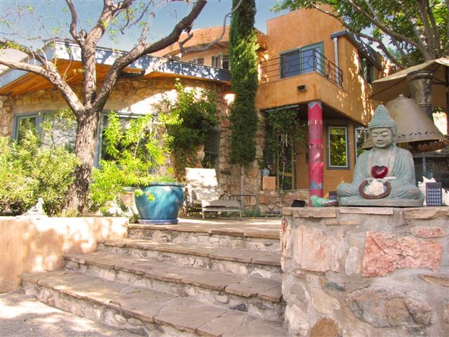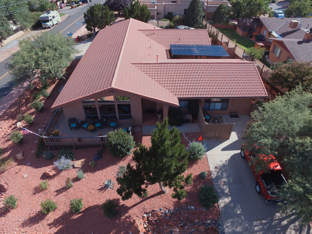 We have a beautiful studio in the heart of Sedona. Its spacious with breathtaking views of the red rocks. Close to numerous trail heads and delicious restaurants. The home is fully solar powered with fresh No-voc paint and cleaned with organic products. There is a huge free standing tub to relax in. The studio has a cozy kitchenette with a full size refrigerator. The private redwood deck is an ideal place to have coffee as you savor one of the best views of Thunder Mountain.