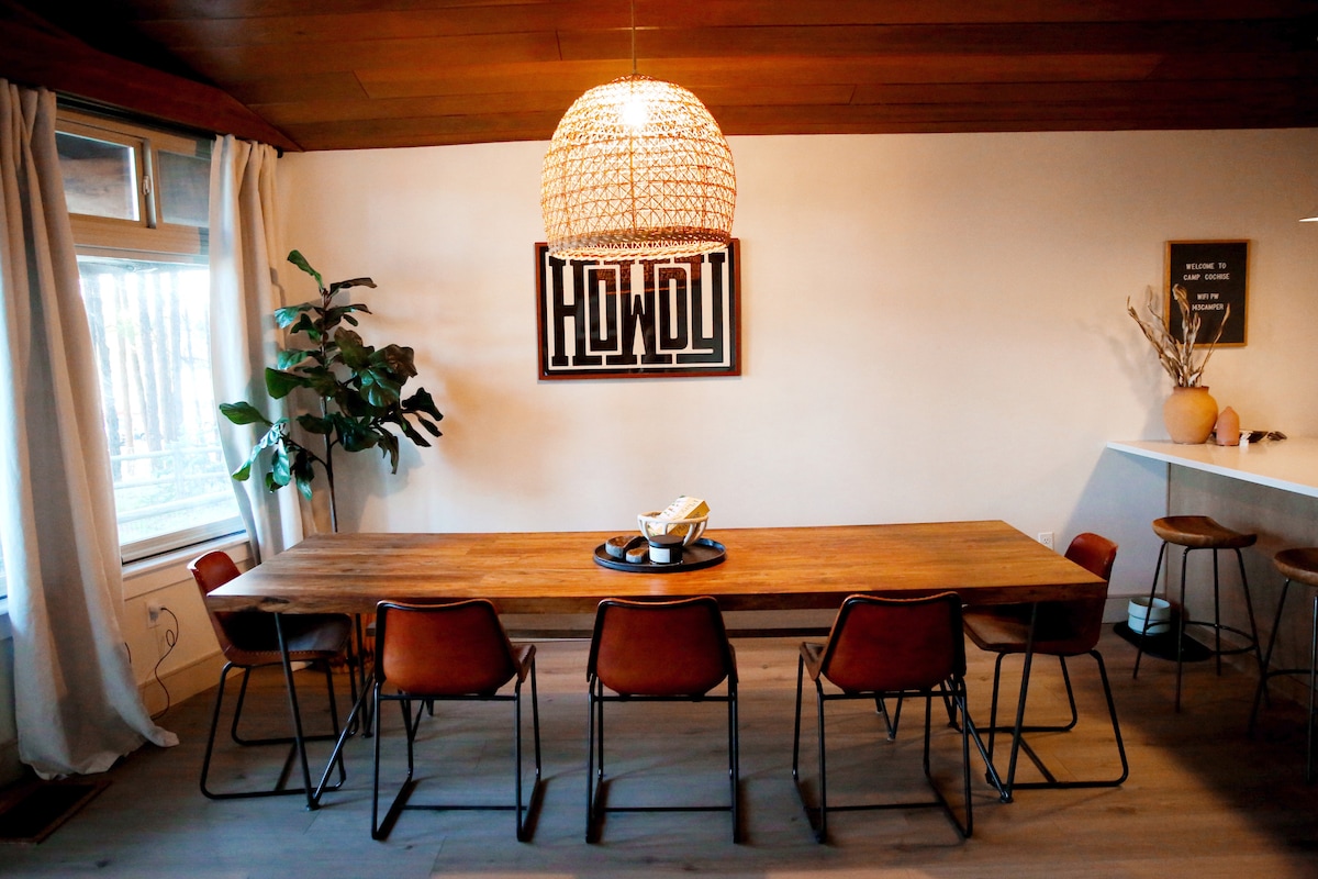 Casa La Courta is located along Oak Creek and is within walking distance to the iconic Cathedral Rock. You can access many other hiking and mountain biking trails from the property. The cabin is on five private acres and is surrounded by pomegranate, fig, apricot and lemon trees and has a grassy yard with a bocce ball court. It’s the perfect spot to unwind and recharge. There is a trail down to the creek, so you can take a dip after a day of hiking. STR Permit #017132